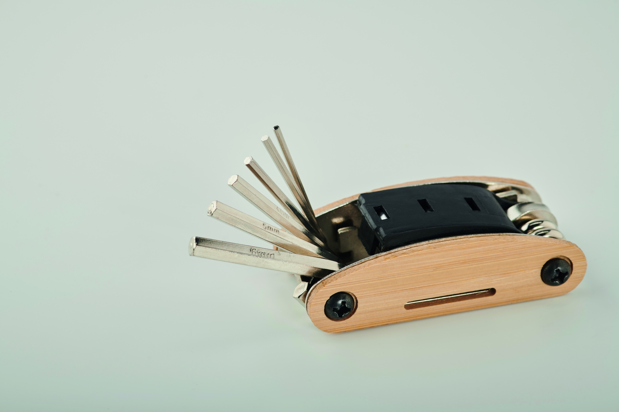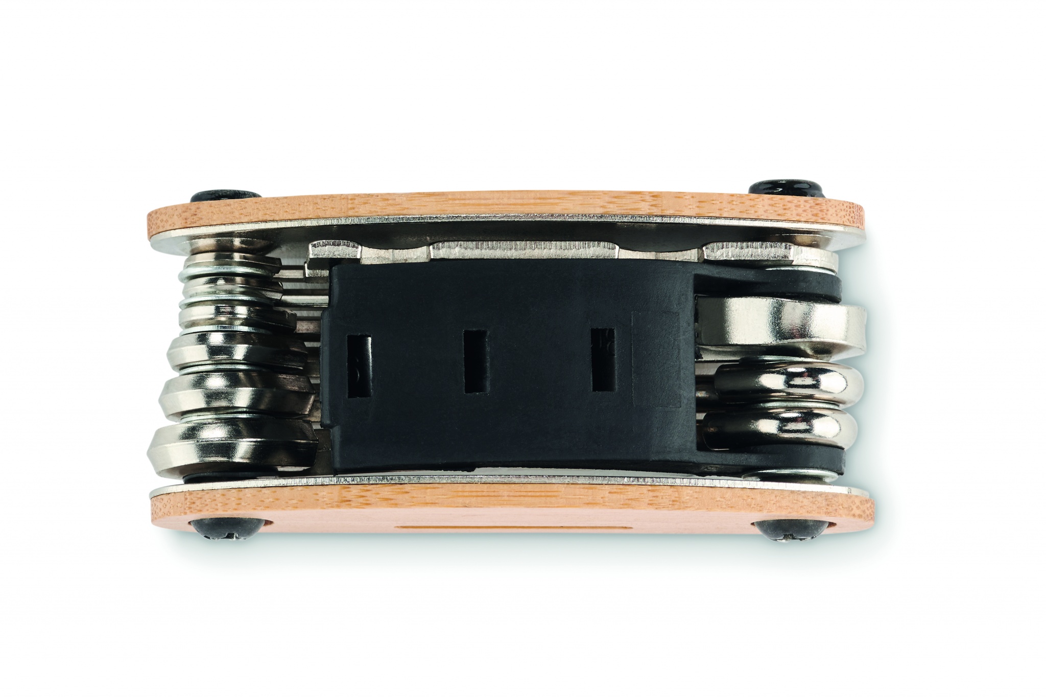 Stainless steel multi-function pocket tool with bamboo cover. 11 functions. It includes: hex keys, flat wrench , sleeve extension, Phillips screwdriver and socket spanner.