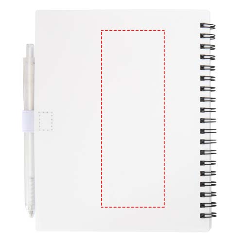 The Niove soft cover notebook is made of recycled plastic with 70 dotted sheets of 70 g/m² paper. The notebook has square corners and a pen loop. Notebook size: 140 x 178 mm. The ballpoint pen is also made of recycled plastic. Ink colour: Blue. Writing length: 1000 meters. Nib size: 1.0 mm.