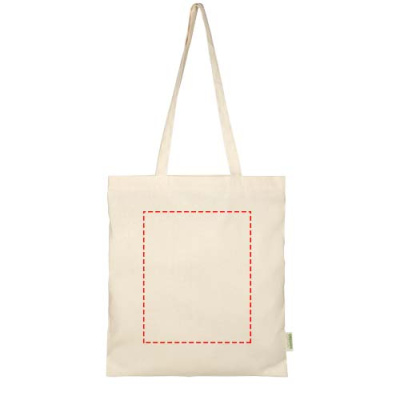 Tote bag made from 100% OCS certified 100 g/m² organic cotton originating from India, featuring a large open main compartment providing plenty of space to carry around all of the essentials. The 32 cm long handles makes it comfortable and easy to carry around wherever you go. Resistance up to 5 kg weight. Volume capacity: 7 litres.