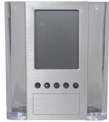 Pen holder with calendar alarm clock and thermometer. 1 cell battery included.