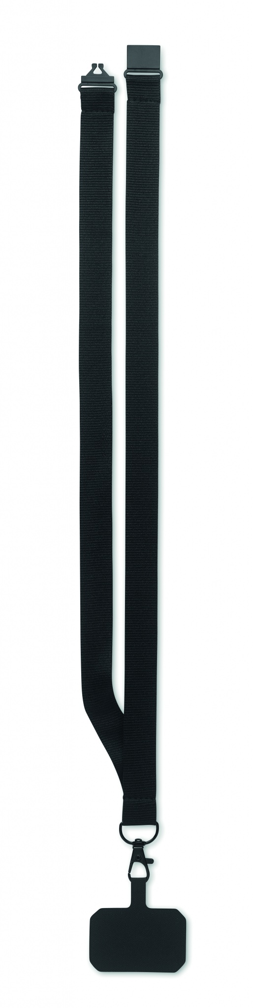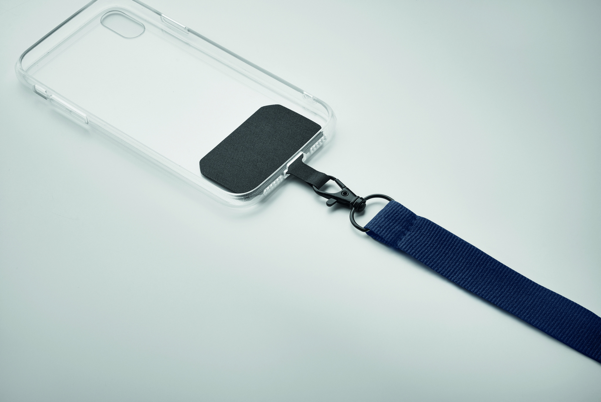 Lanyard in polyester with phone cord holder and safety buckle. 2 cm.