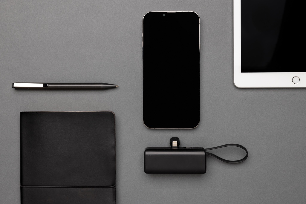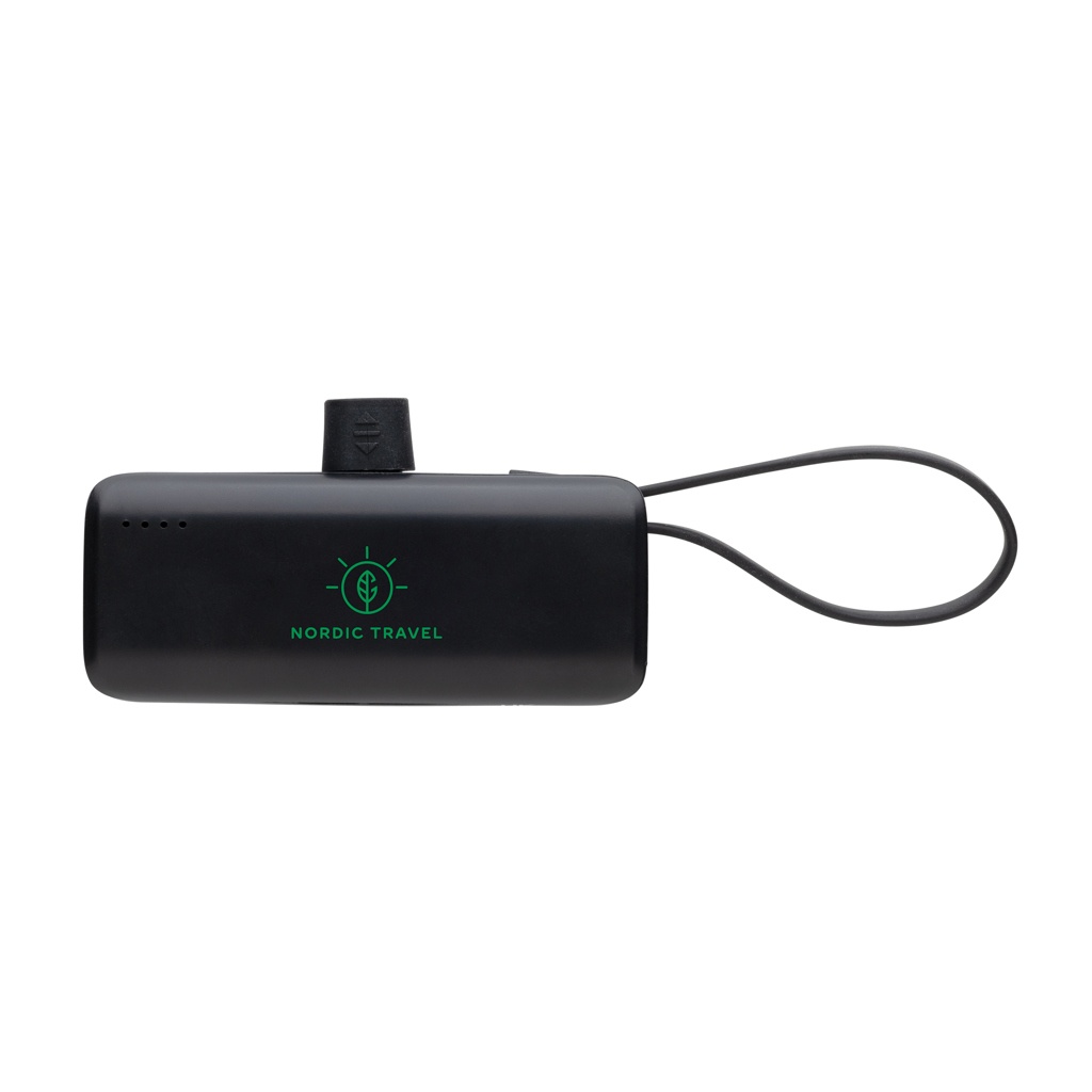 Portable and pocket size powerbank that’s easy to bring on the go. The powerbank comes with a lightning connector plug that you can easily connect to your iPhone to start charging direct. The 3000 mAh powerbank also has an integrated USB C input and output cable that can be used to charge USB C items and to re-charge the powerbank. No need to carry any cables to use or re-charge this powerbank. Made with recycled ABS and recycled TPE. Total recycled content: 19% based on total item weight. RCS certification ensures a completely certified supply chain of the recycled materials. Packed in FSC® packaging. PVC Free. Input: 5V/2.1A Output 5V/2.4A.