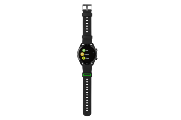 Modern lifestyle watch with 1.28” round full touch screen to track your activities all day long. With integrated MIC to answer phone calls on the watch. Made with RCS (Recycled Claim Standard) certified recycled TPU armband and metal frame. Total recycled content: 22% based on total item weight. RCS certification ensures a completely certified supply chain of the recycled materials. Features include: Step count, calories, distance, multi-sport tracking, alarm clock, heart rate tracking, blood pressure monitoring, sleep monitor, calendar updates, make and receive calls, notifications: SMS, Facebook, Skype, WhatsApp, Twitter etc. Compatible with Android 4.4 and IOS 8.0 and above.. BT 4.0. Standby time of 15 days and working time up to 5 days. Including clip charger to charge the watch. Packed in FSC® mix kraft packaging. Item and accessories 100% PVC free.