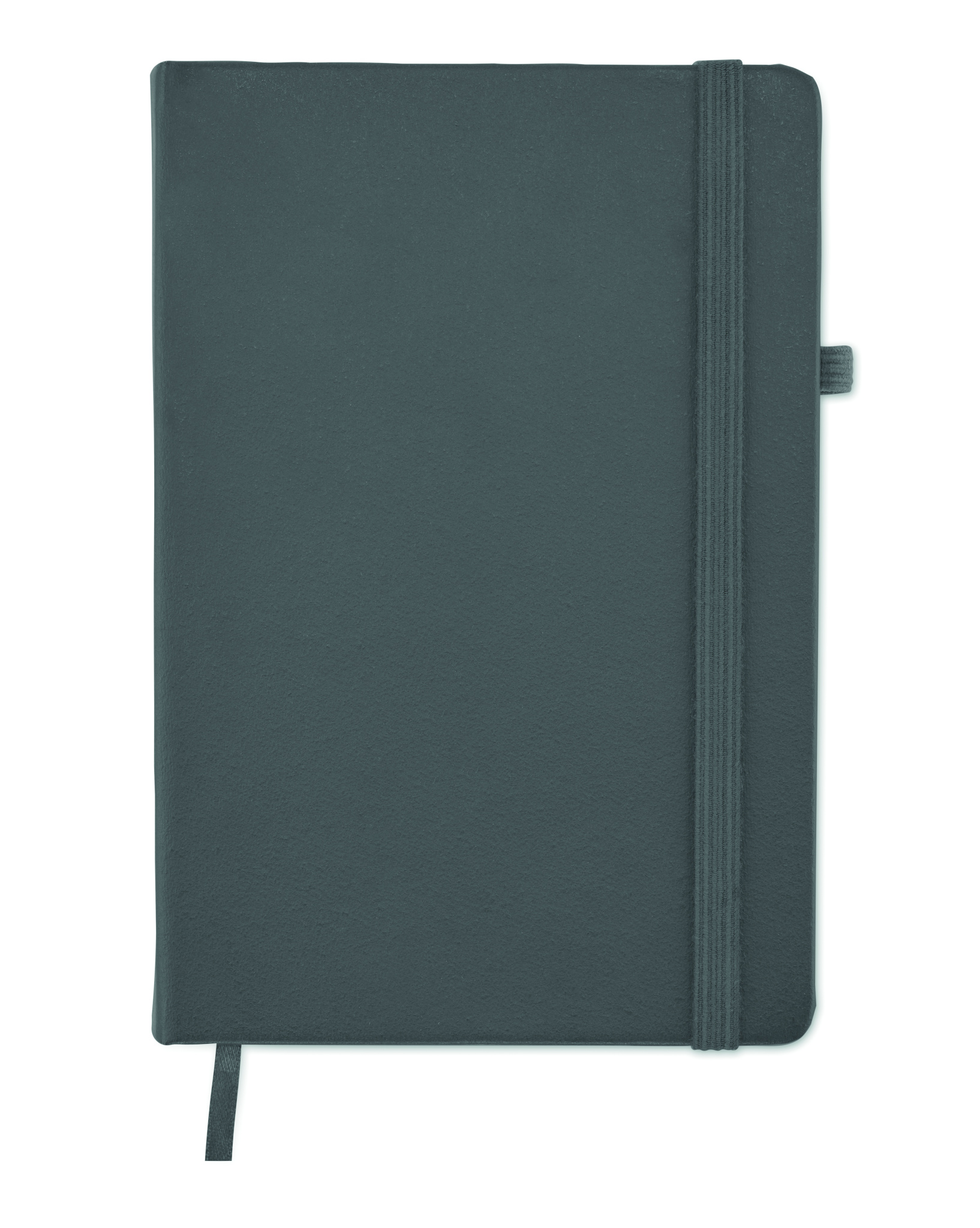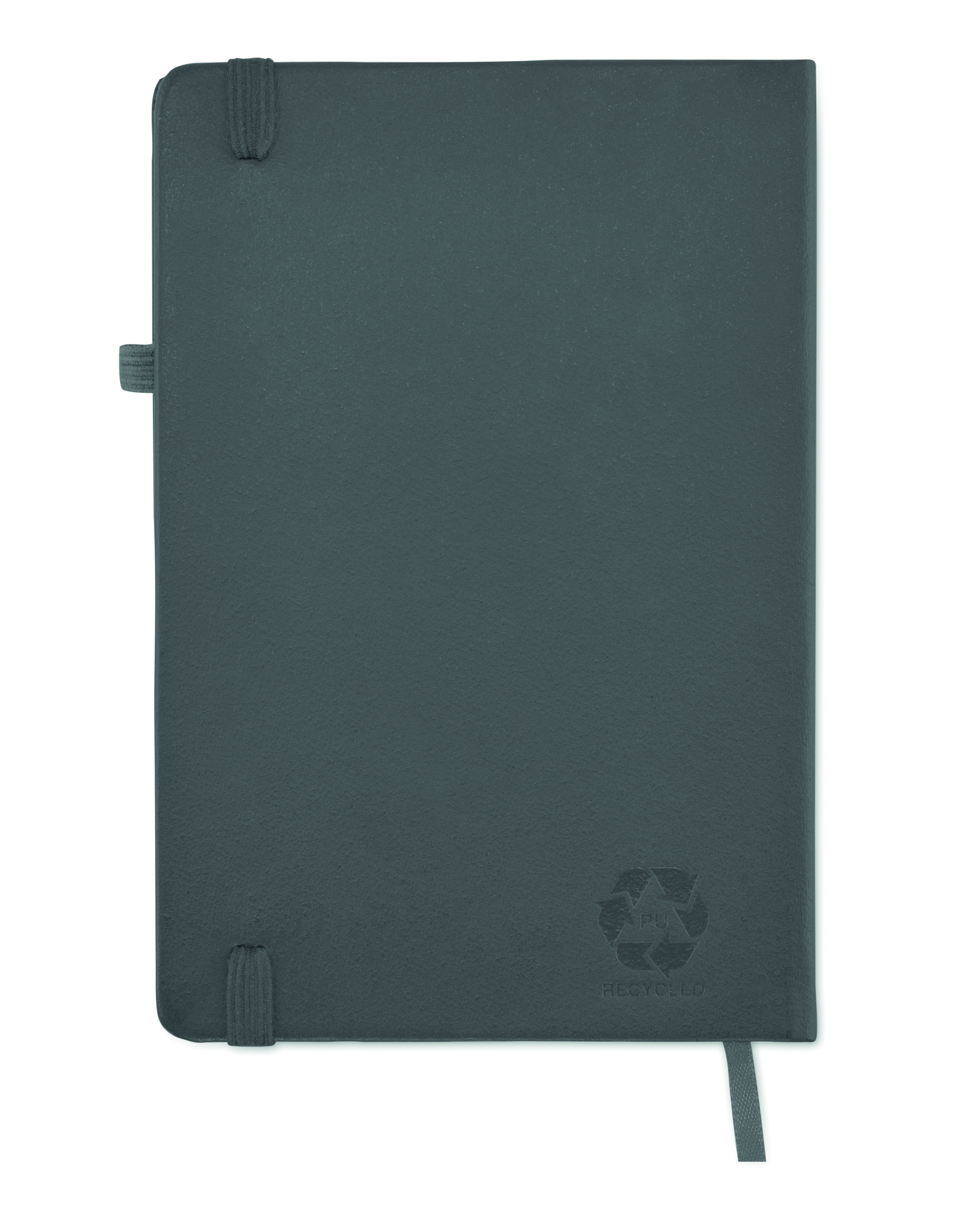 A5 notebook with 70% recycled pre-consumer leather and 30% latex PU cover. Casebound. 192 lined pages recycled paper (96 sheets). Matching elastic closure strap and pen holder.