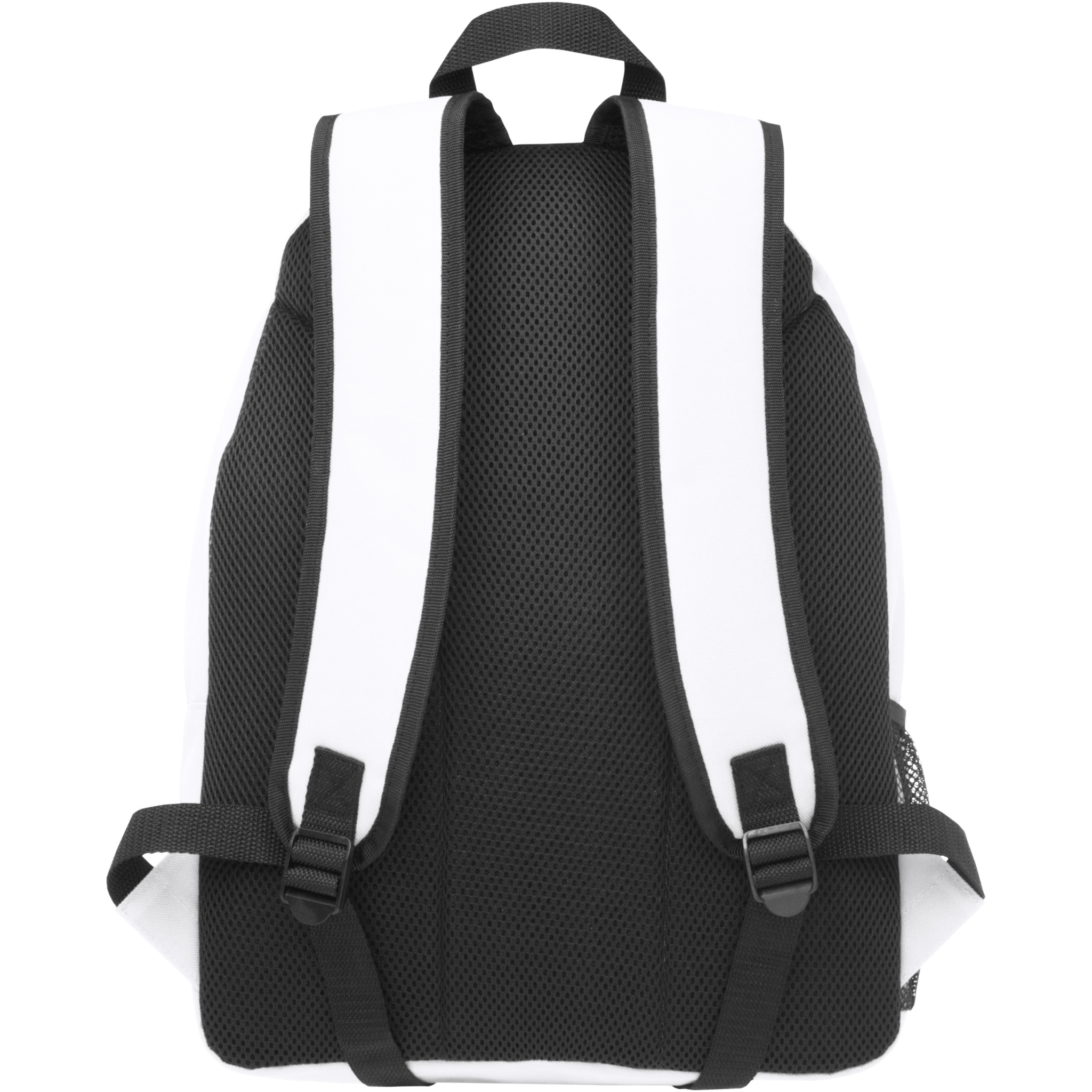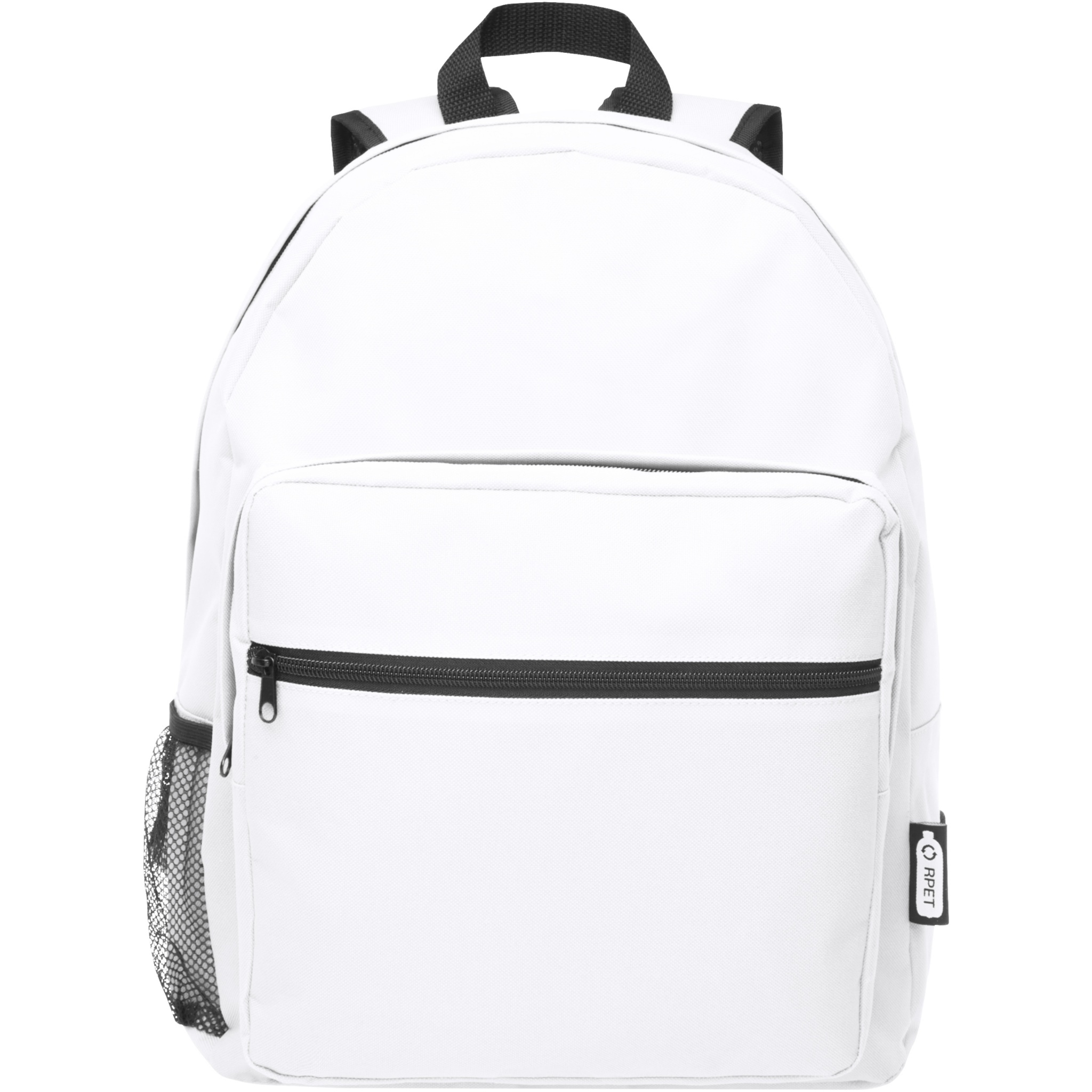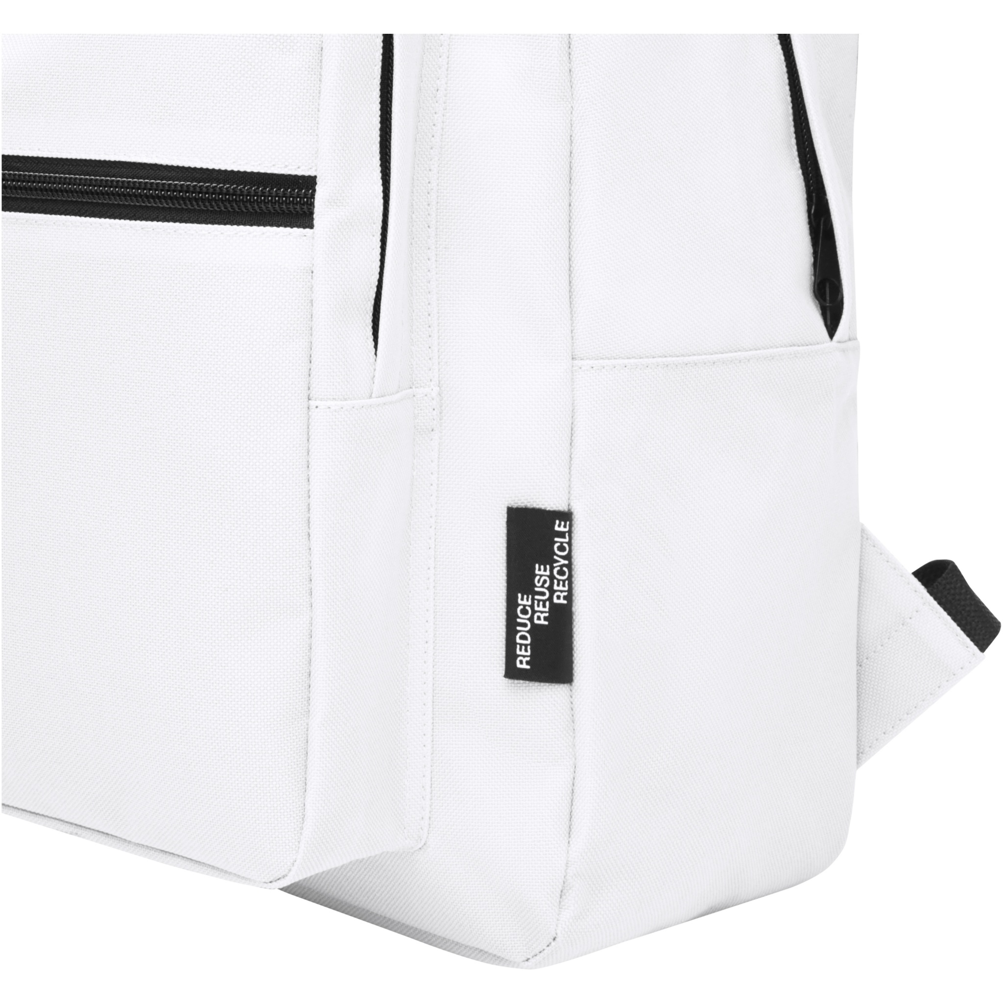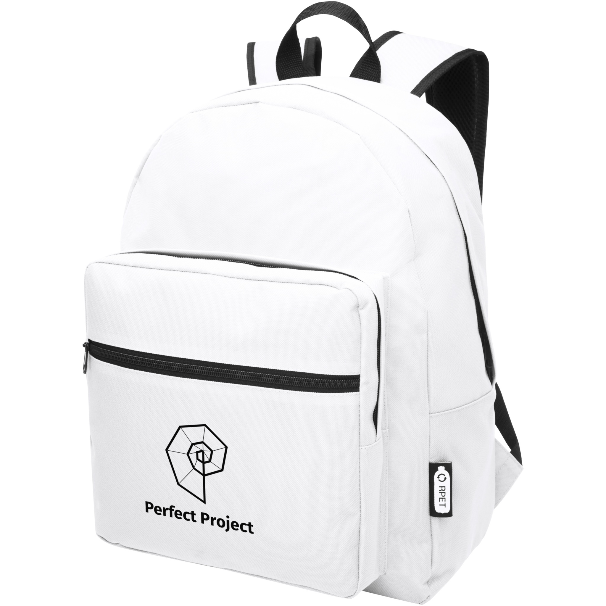 Durable backpack made of 100% GRS certified recycled, post-consumer polyester which contributes to the reduction of plastic waste. Features adjustable shoulder straps, 2 zipper compartments, and a front zipper pocket. Approximately 15 bottles are recycled to make this bag.