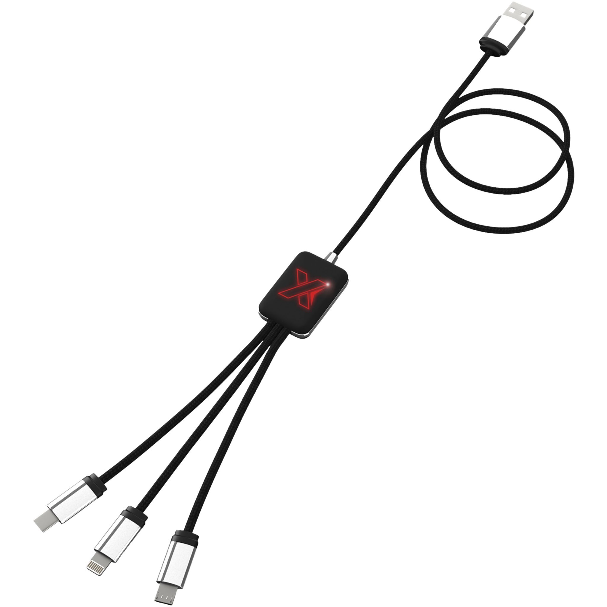 Light-up logo charging cable with rubber and metal finish fitted with three connectors (Type-C, Android, iPhone). Up to three devices can be charged simultaneously. Length of cables (including plugs): 10 cm. Total cable length: 1 metre. Recycled PET plastic cable and packaging is made of recycled paper and recycled plastic.