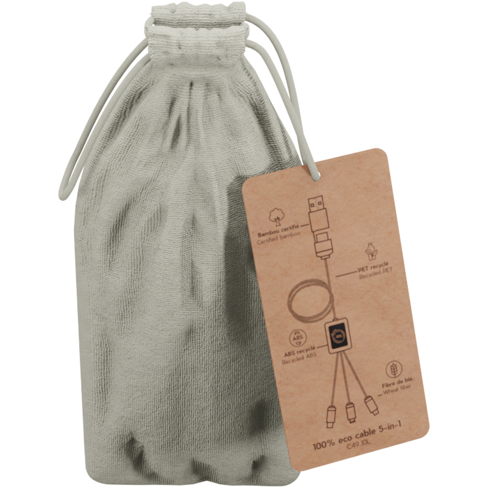 2.4A fast charging cable (3 x 10 cm) that can be customised with light-up logo on both sides, which also can be different from each other. This cable is entirely made with more sustainable materials: recycled PET cords, bamboo, wheat fibres and recycled plastic. The charging cable is made to be universal thanks to its 3 outputs (Type-C, Android, iPhone), and it can charge up to three devices simultaneously. Thanks to its double USB and USB-C input, this cable is compatible with the most recent chargers. Delivered in a cotton pouch (20 x 8 cm) with a kraft paper card.