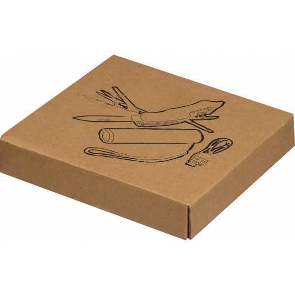 Attractive set of a torch and a pocket knife. The torch has a bamboo casing and an integrated 500 mAh battery. The pocket knife is equipped with the following functions: Knife, scissors, a bottle opener, a serrated knife, a corkscrew, a nail file, a Phillips screwdriver, a fish scaler, a fish hook remover and a punch awl. Your logo will be laser engraved on both parts in the same size.