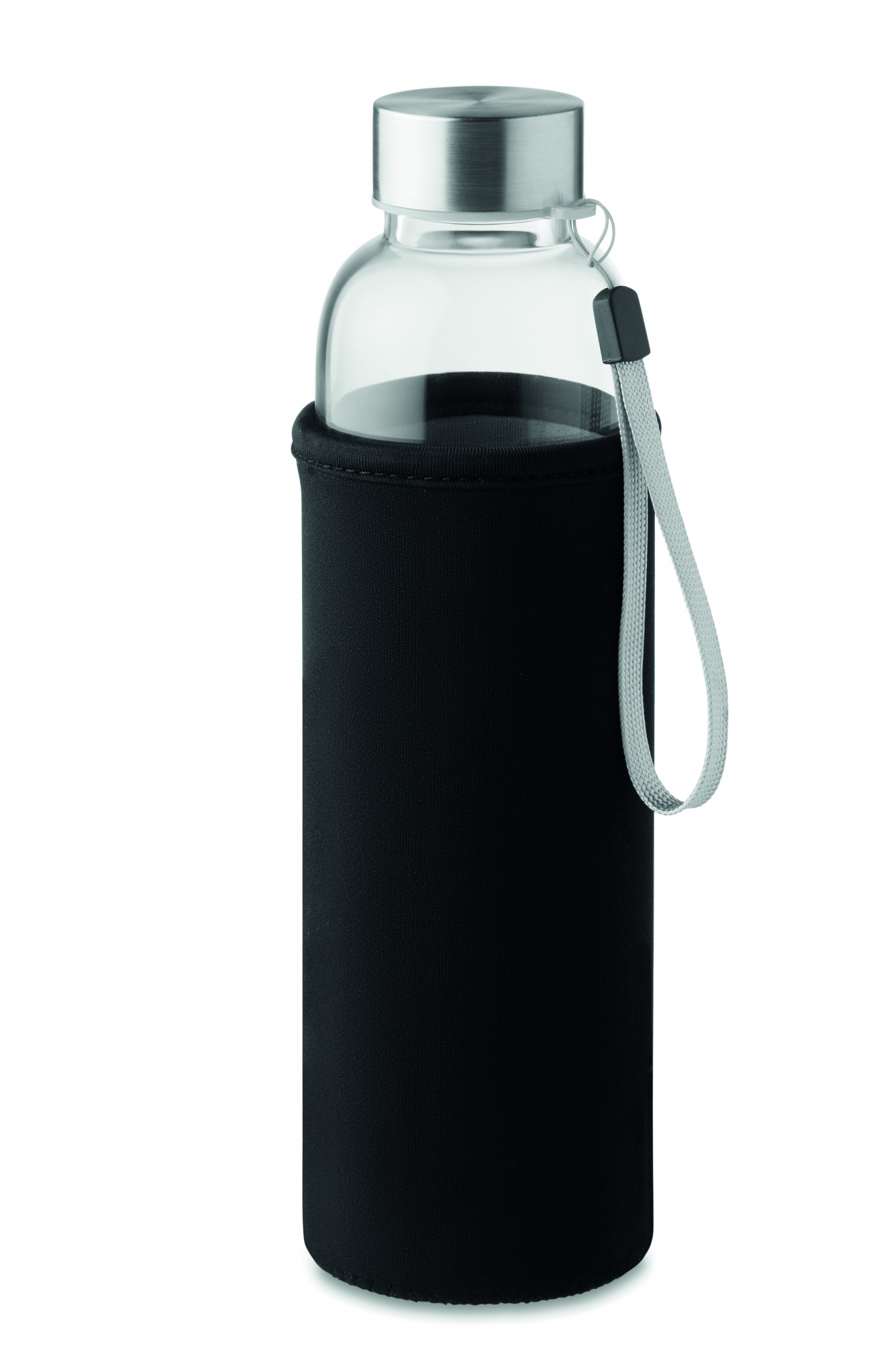 Single wall in high borosilicate glass bottle with tea infuser and neoprene pouch. Capacity 500 ml. Not suitable for carbonated drinks. Leak free. Laser engraving is not possible on borosilicate glass.