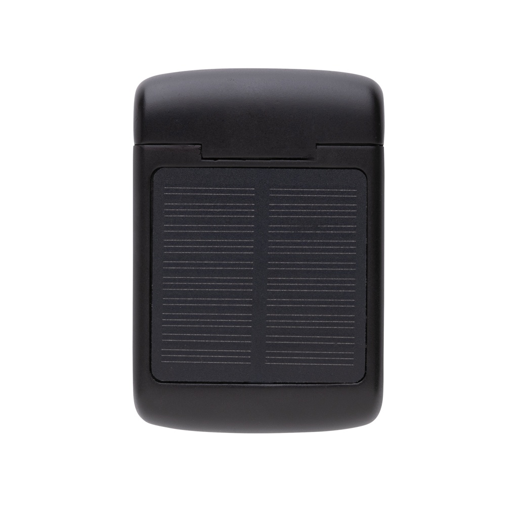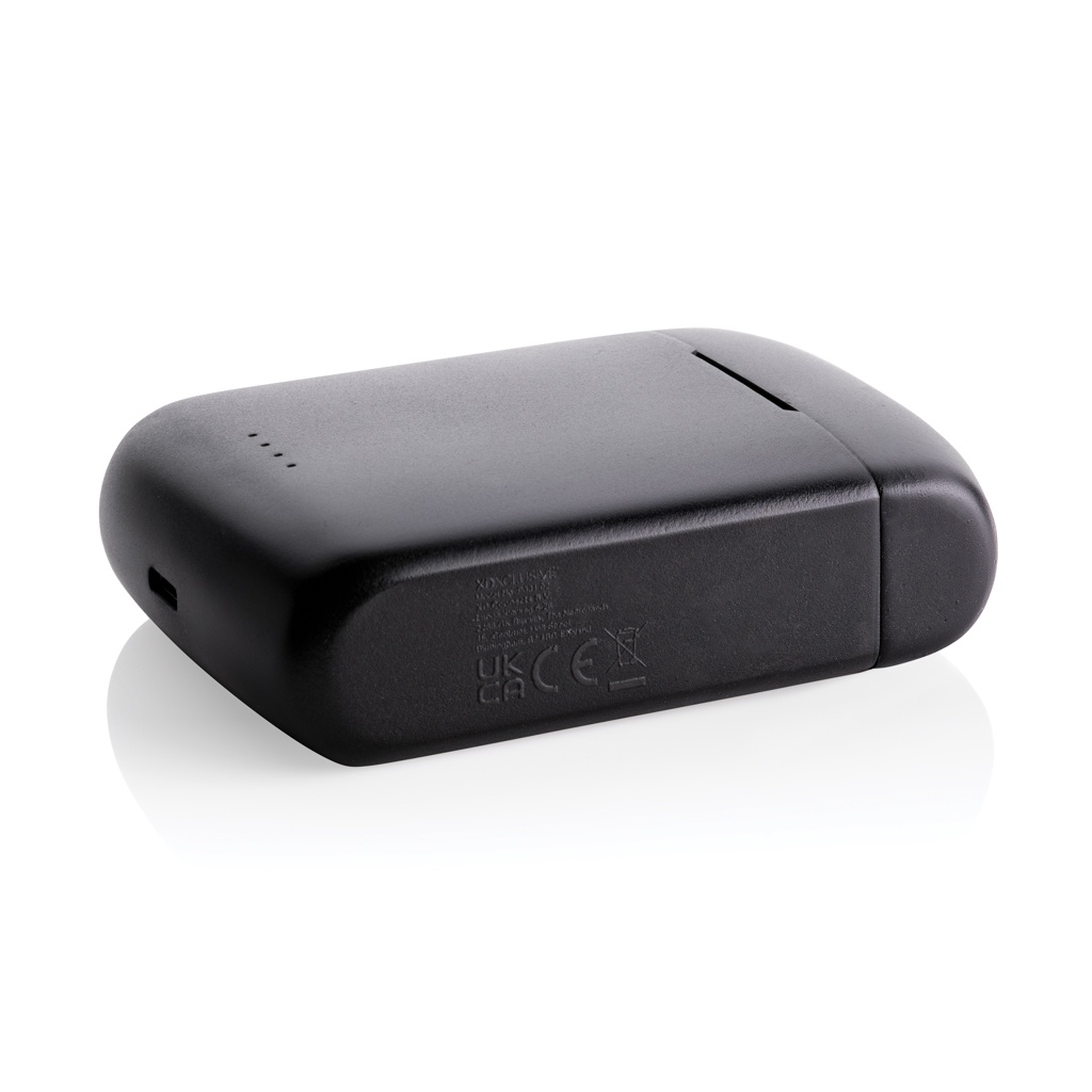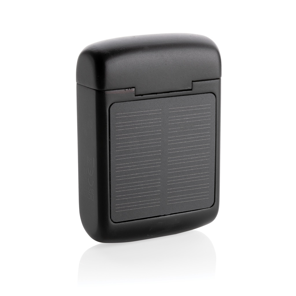 Unique double chargeable wireless earbuds with integrated solar panel in the casing made with RCS certified recycled ABS. Total recycled content: 21% based on total item weight. RCS certification ensures a completely certified supply chain of the recycled materials. The speaker uses high quality monocrystalline solar panels with 19% conversion rate. Charge rate depends on conditions. Charging speed solar: 5V/50mA. The perfectly fitting earbuds have a 35 mAh battery and can be re-charged in the 300 mAh charging case within 2 hours. With auto pairing function so easy to pair to your mobile device. Playing time on medium volume up to 5 hours. With BT 5.3 for optimal connection. Operating distance up to 10 metres. With pick up and mic. Including 3 size silicone ear tips abd RCS certified recycled TPE charging cable. Packed in FSC® mix kraft packaging. Item and accessories 100% PVC free.