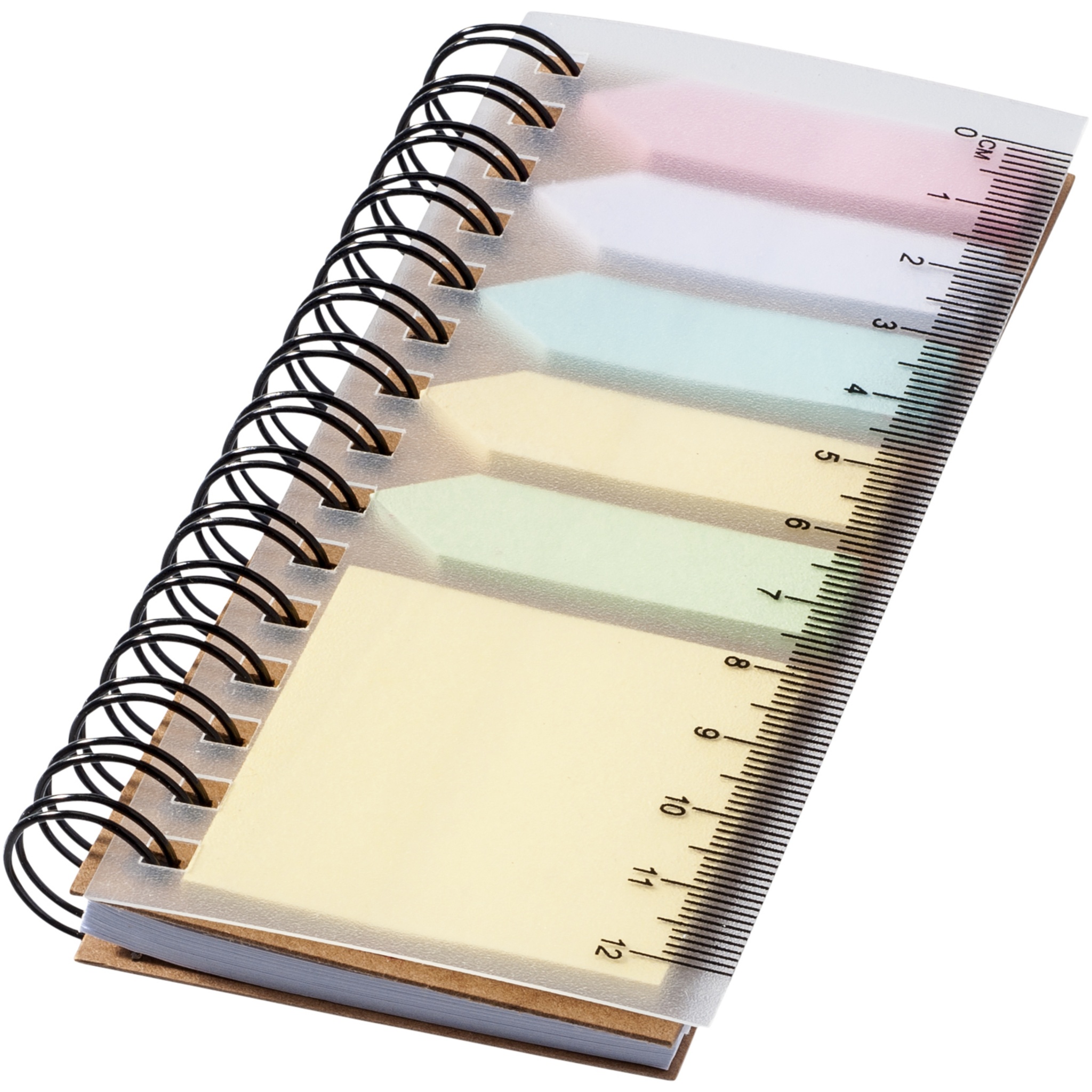 Spinner spiral notebook with coloured sticky notes. Booklet of 25 sticky notes in 5 colours, a sticky notepad with 25 pages and 40 pages of lined, white paper. Includes ruler on the front cover.