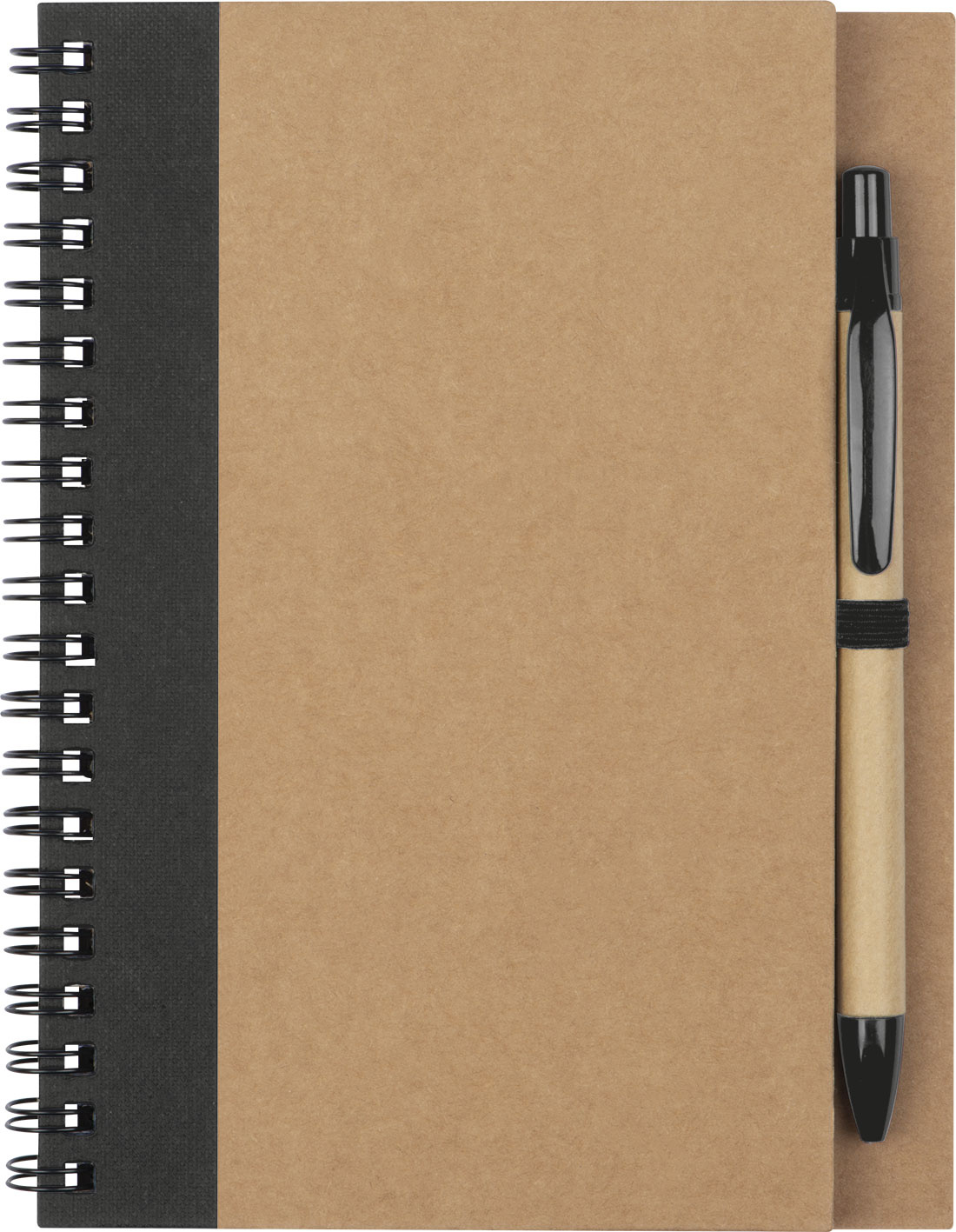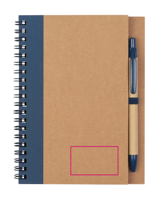 Spiral-bound notebook with 120 blank pages made from recycled paper (cover 250 gsm, pages 60 gsm) and a pen loop. The matching ballpoint pen made from recycled paper, featuring a non-replaceable blue-writing refill and ABS plastic accents, is included.