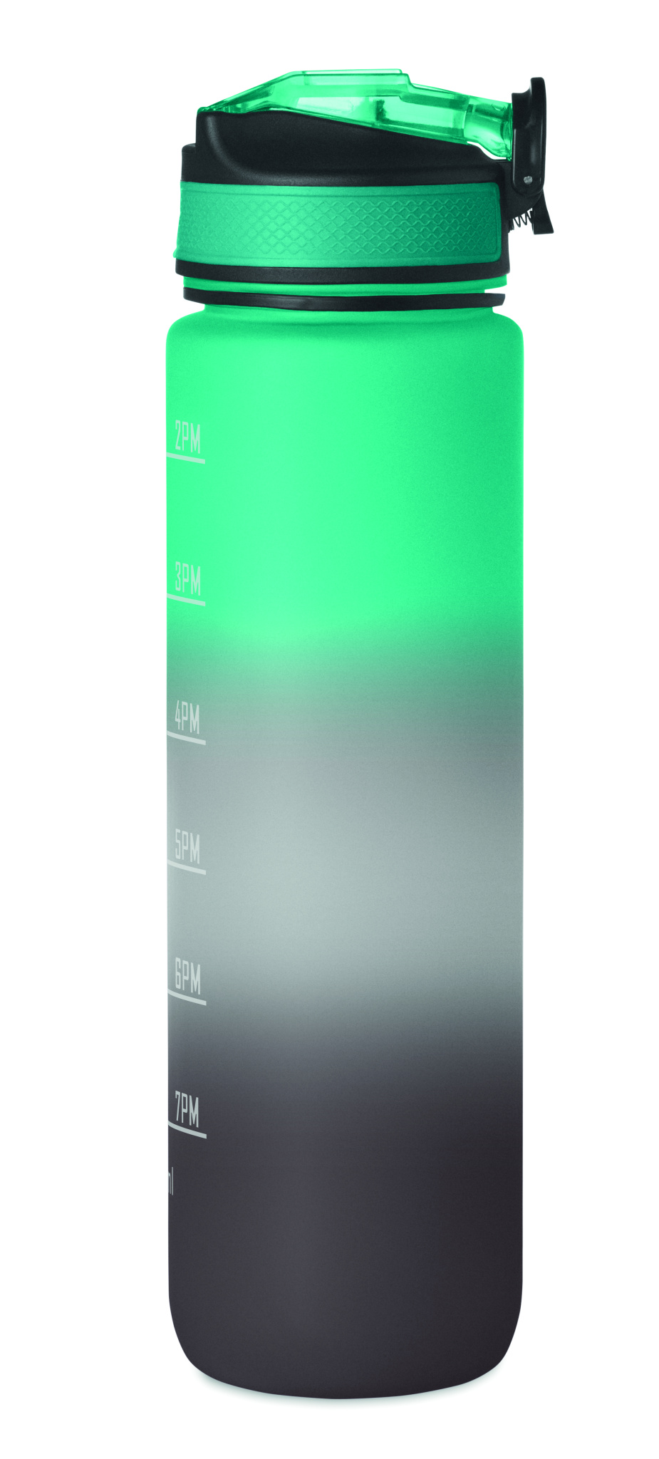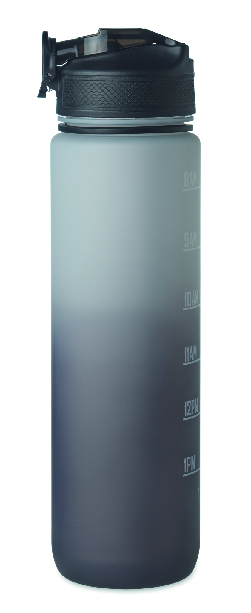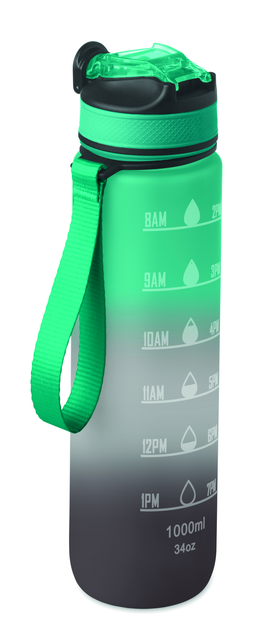 Sports water bottle in RPET with integrated straw, soft silicone mouth piece, motivational time markings, one hand opening flip top lid, safety lock and carrying strap. Capacity 1L.