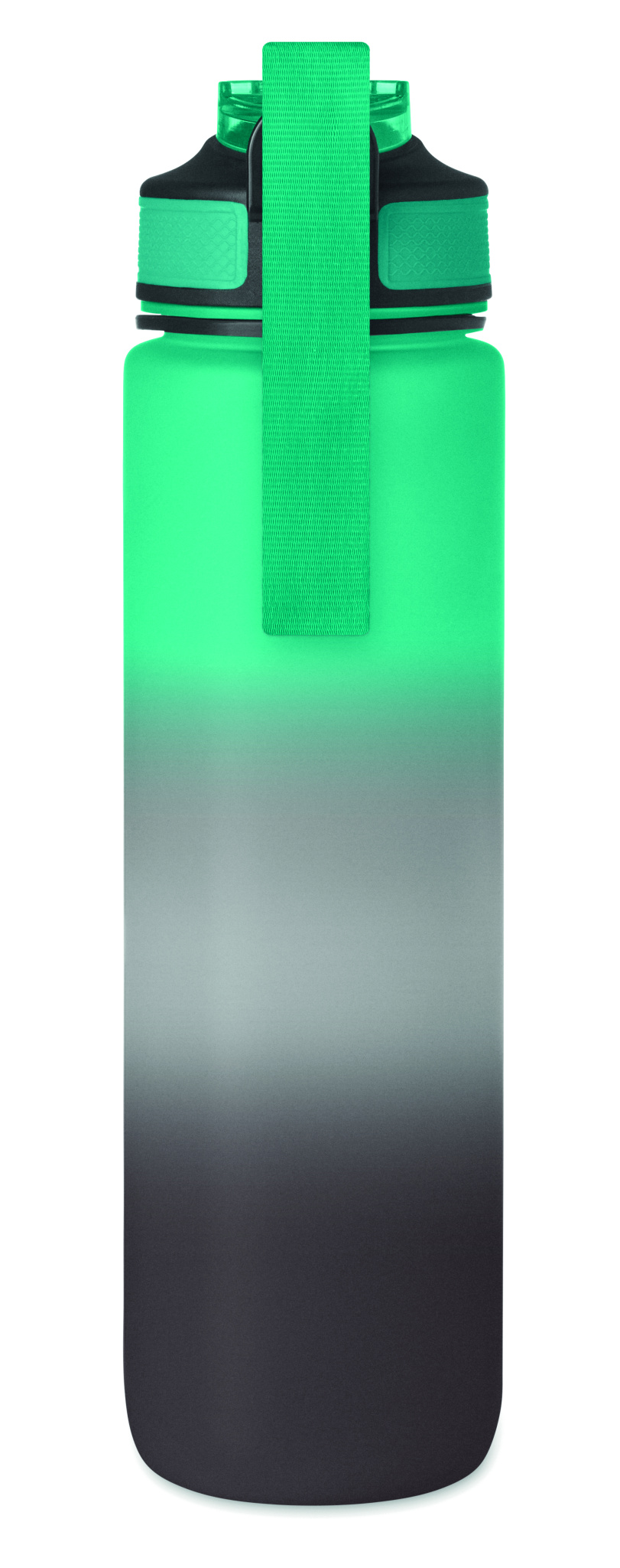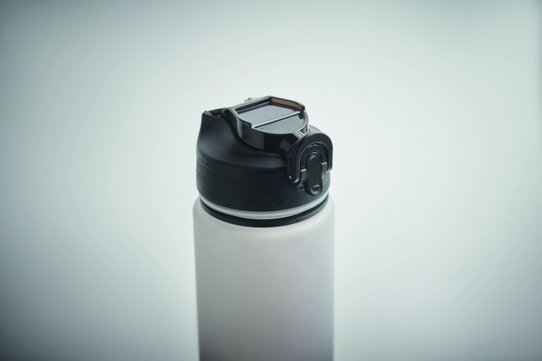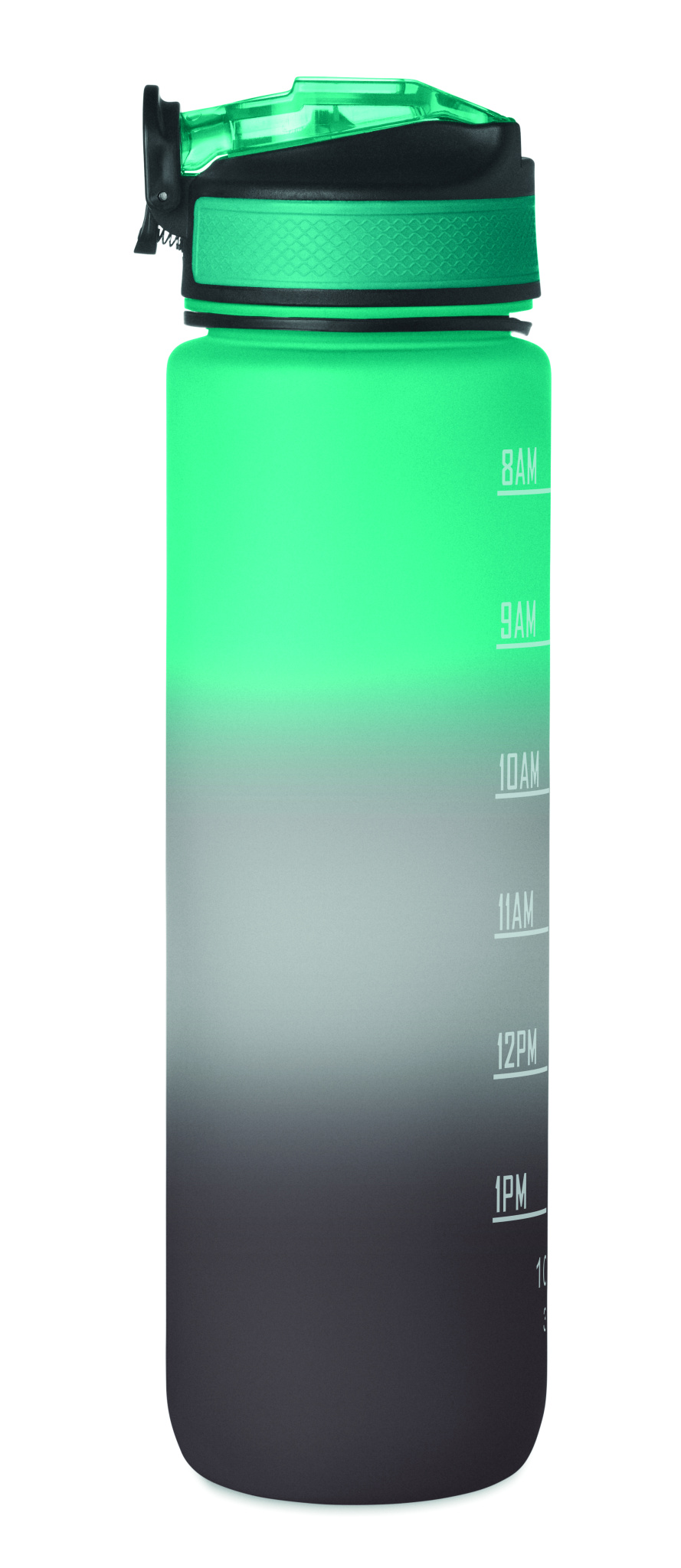 Sports water bottle in RPET with integrated straw, soft silicone mouth piece, motivational time markings, one hand opening flip top lid, safety lock and carrying strap. Capacity 1L.