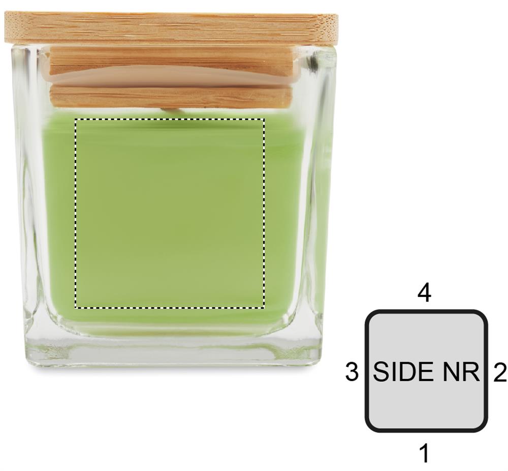 Fragranced plant based wax candle in squared glass holder with a bamboo lid. 50 gr. Burn time: 8 hours. White(06) vanilla, yellow(08) lemon, orange(10) orange, green(48) apple.