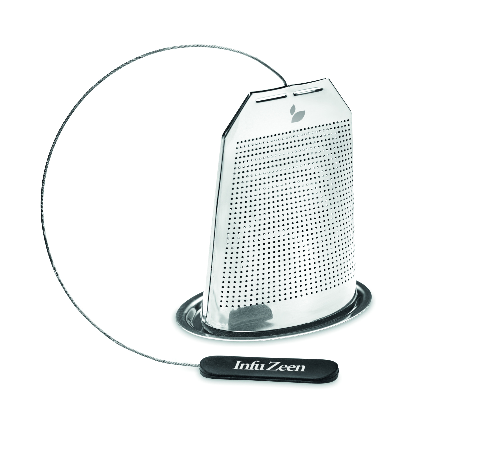 Stainless steel tea infuser in teabag shape with plate. Large tea strainer with silicone handle.