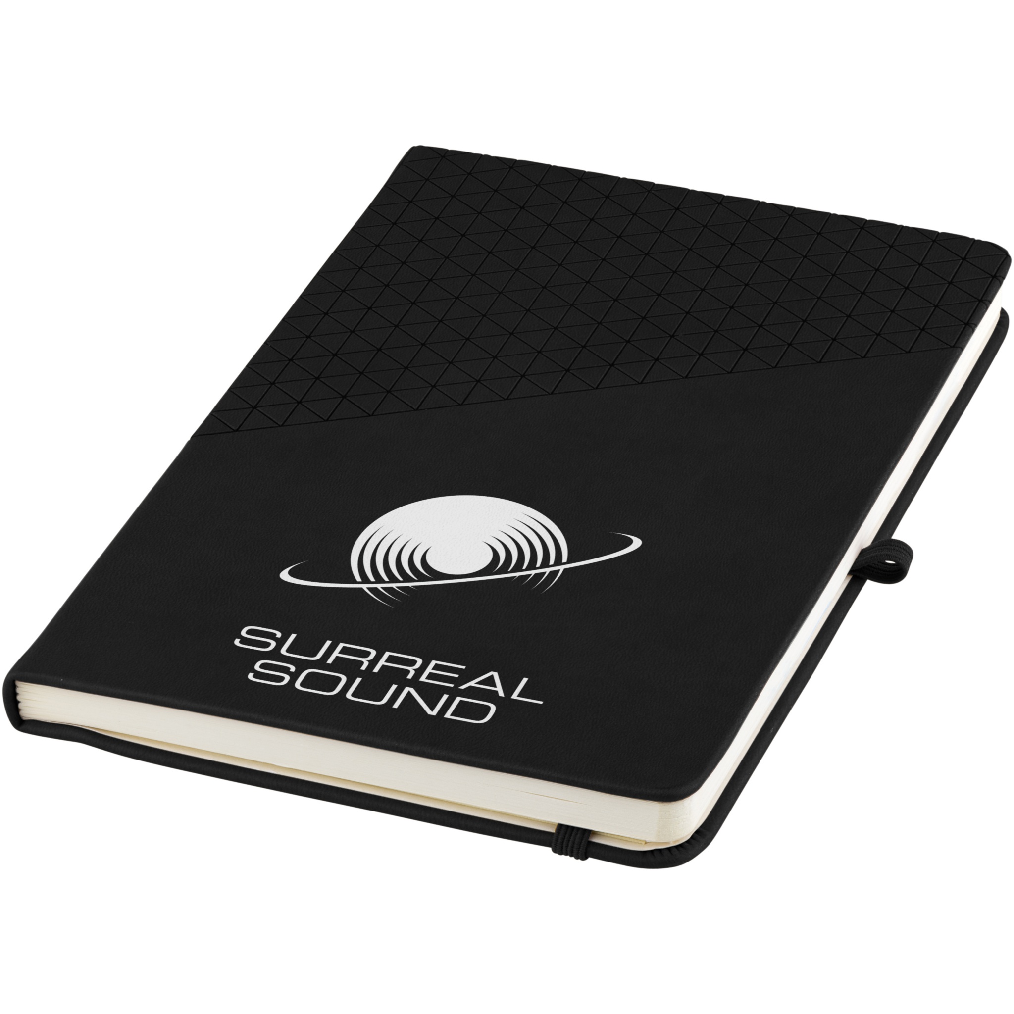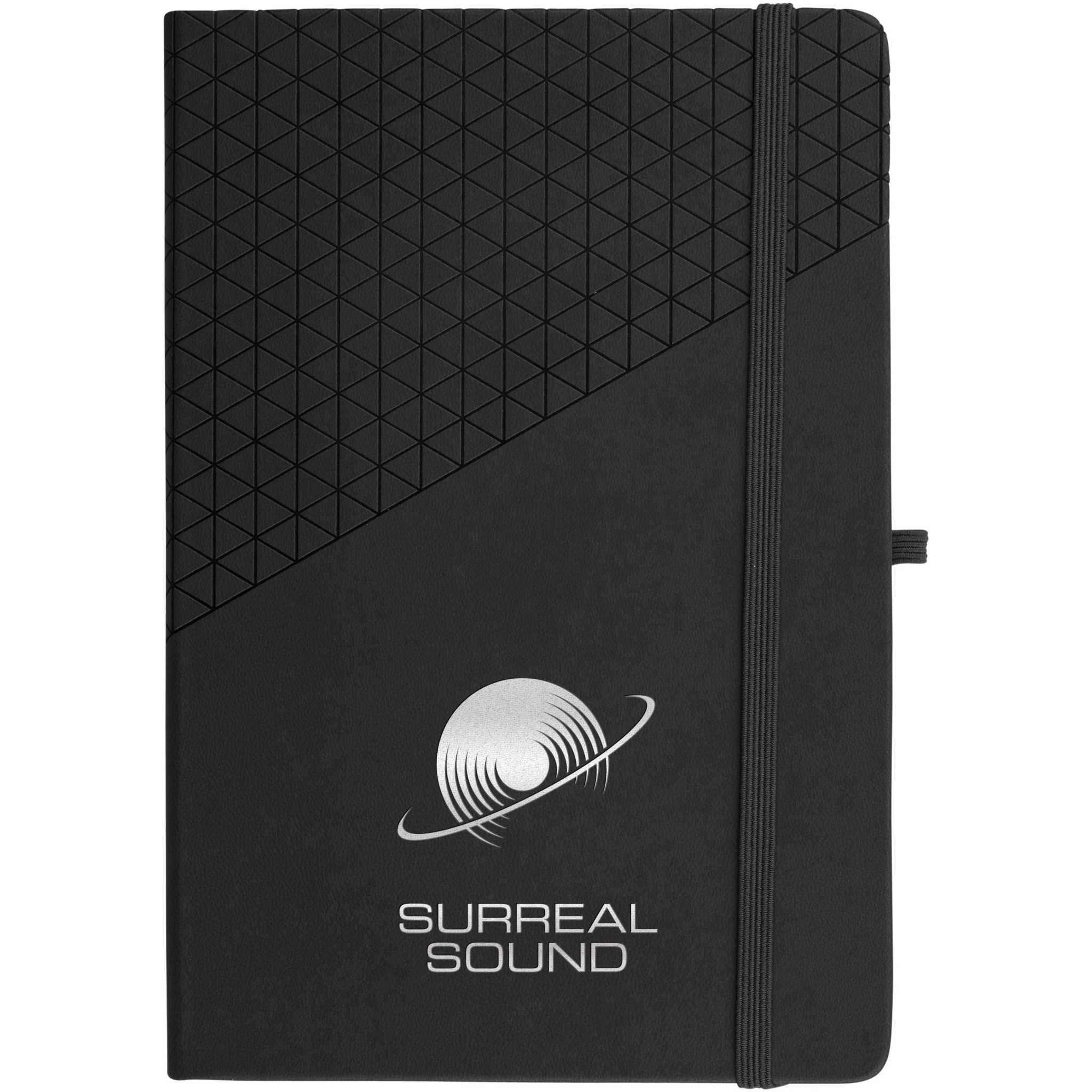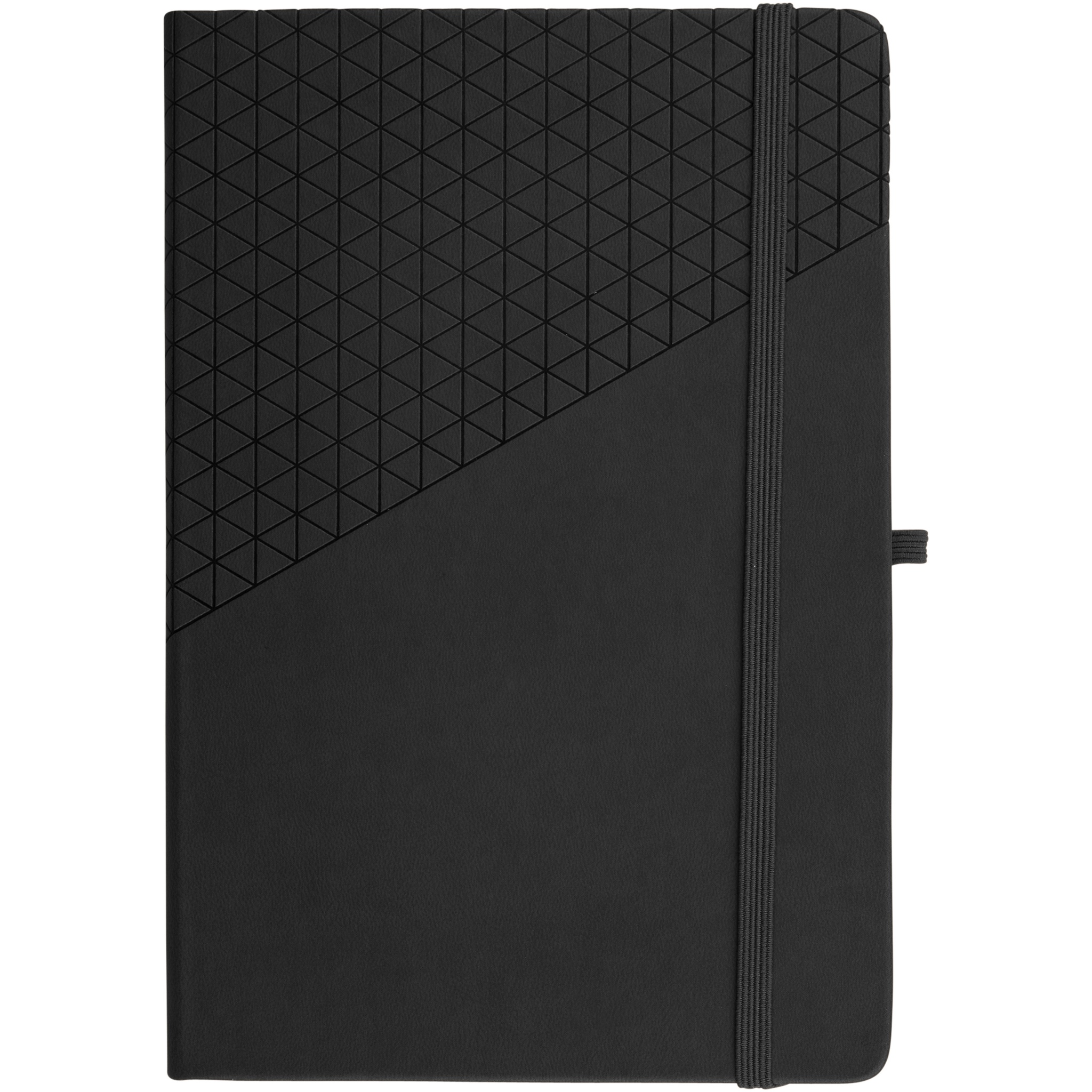 Soft touch geometric pattern design A5 size notebook. Incl. 80 sheets (80gsm) lined paper, ribbon marker, elastic closure and pen loop.