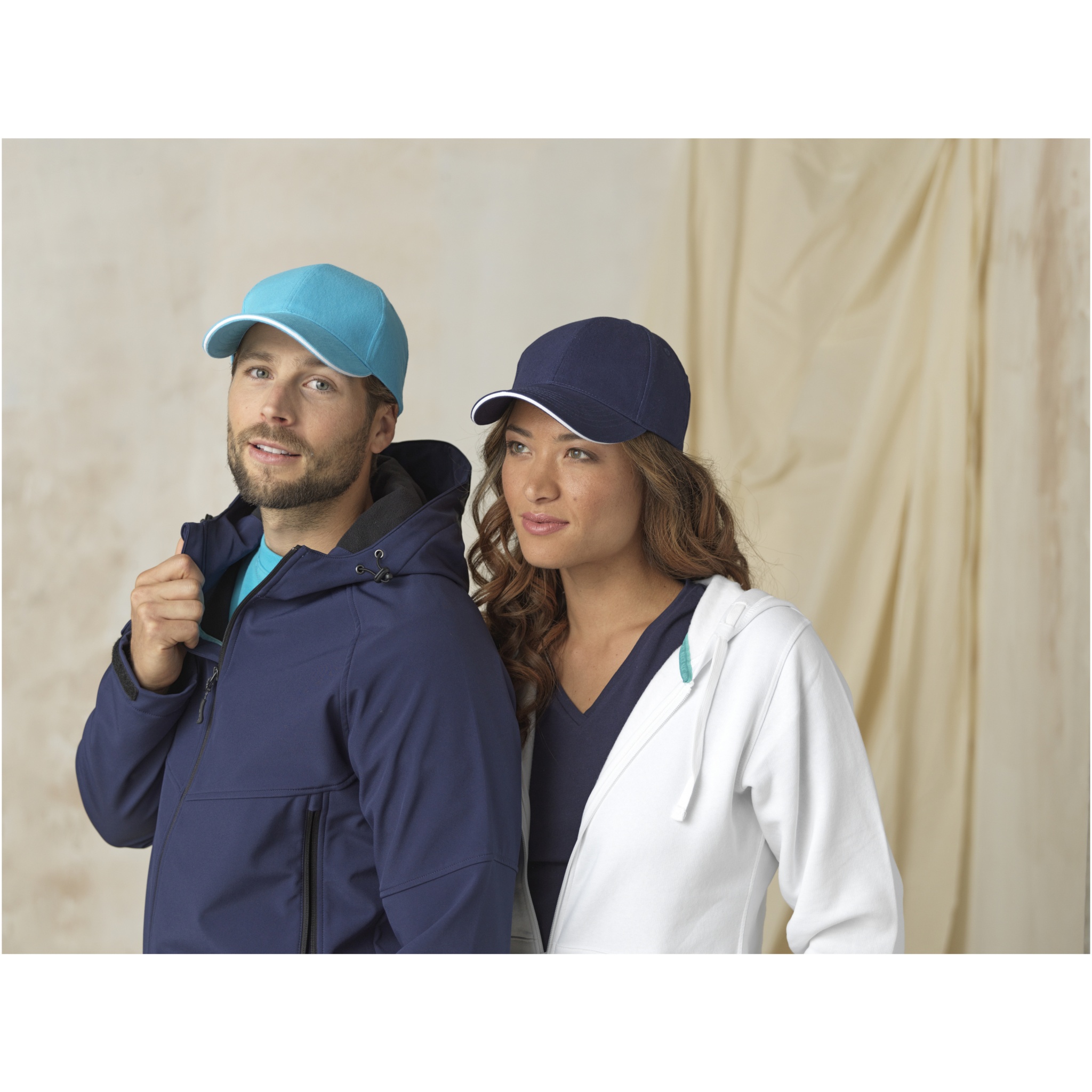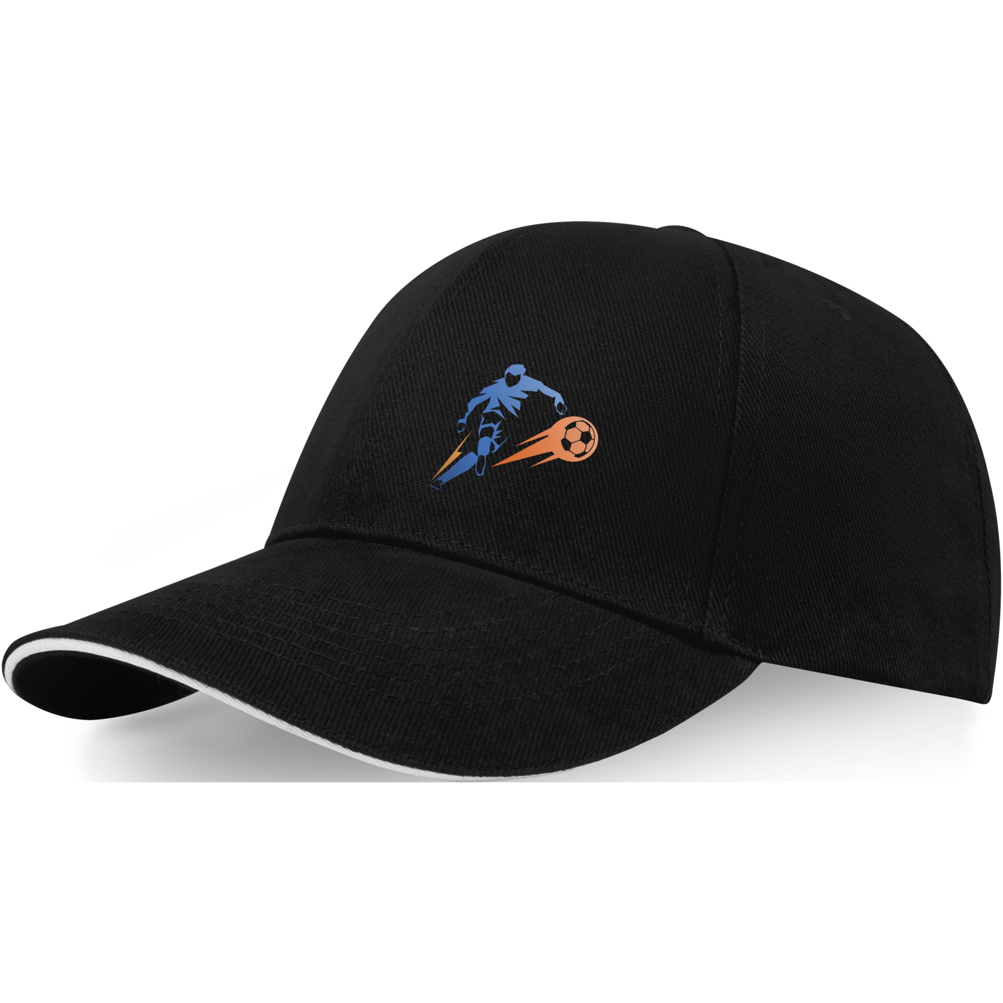 Sustainable promotional headwear. Pre-curved visor with sandwich. Embroidered eyelets for ventilation. Tri-glide metal buckle closure. Head circumference: 58 cm.