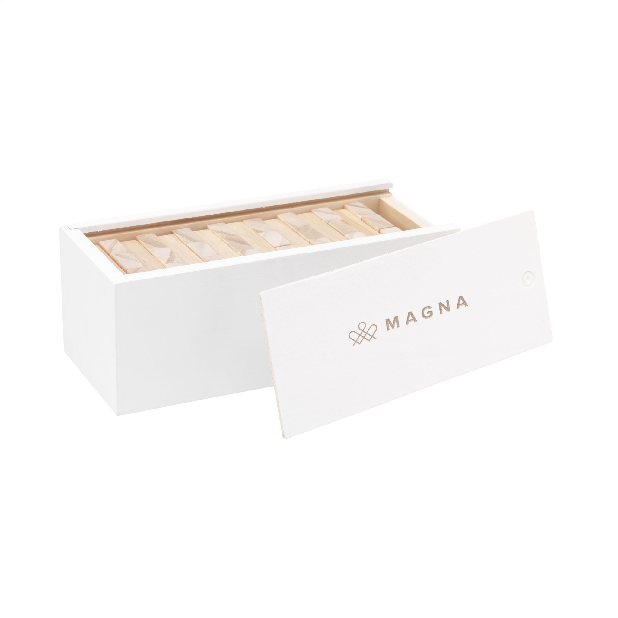 Wooden stacking game (48 blocks). Tower dimensions 16.5 x 6 x 6 cm. Presented with a white, wooden box with sliding opening for easy storage. Incl. instructions. Each item is supplied in an individual brown cardboard box.
