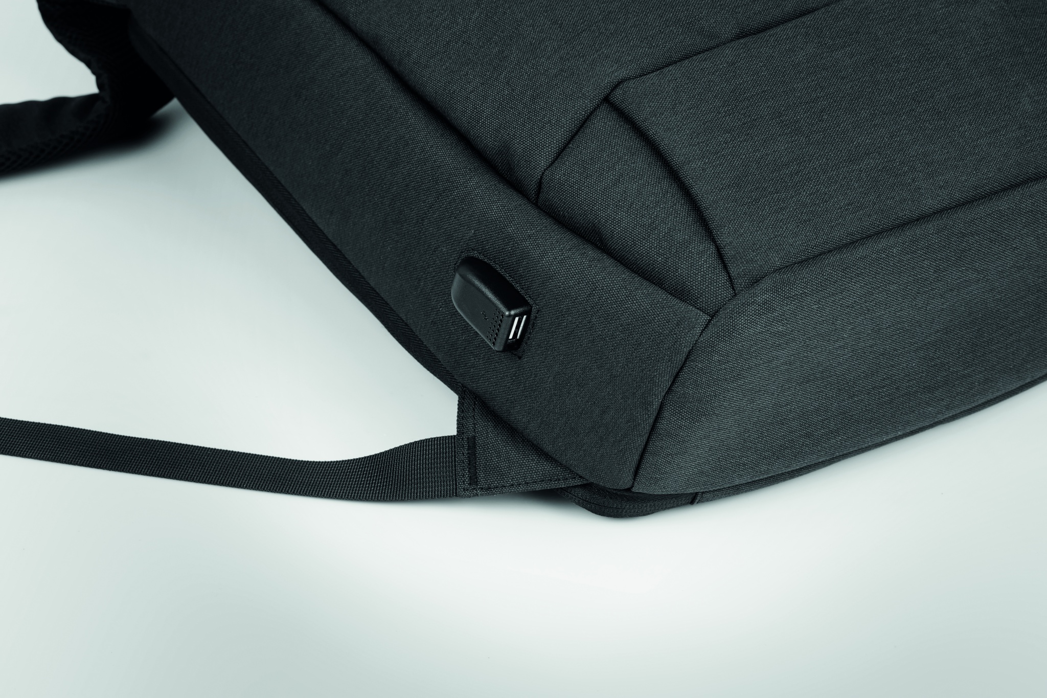 Backpack trolley in 360D 2 tone polyester. Includes one internal 15 inch laptop compartment and one main front part with zipper pocket. Padded back and shoulder straps. Includes Tablet compartment. Has an integrated sleeve for protecting the wheels when carrying.