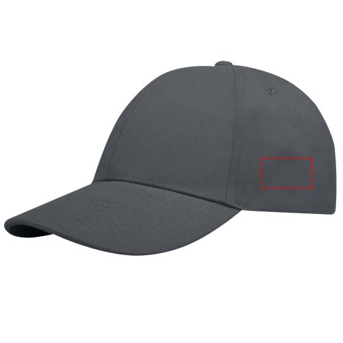 Sustainable promotional headwear. Pre-curved visor. Embroidered eyelets for ventilation. Tri-glide metal buckle closure. Head circumference: 58 cm.