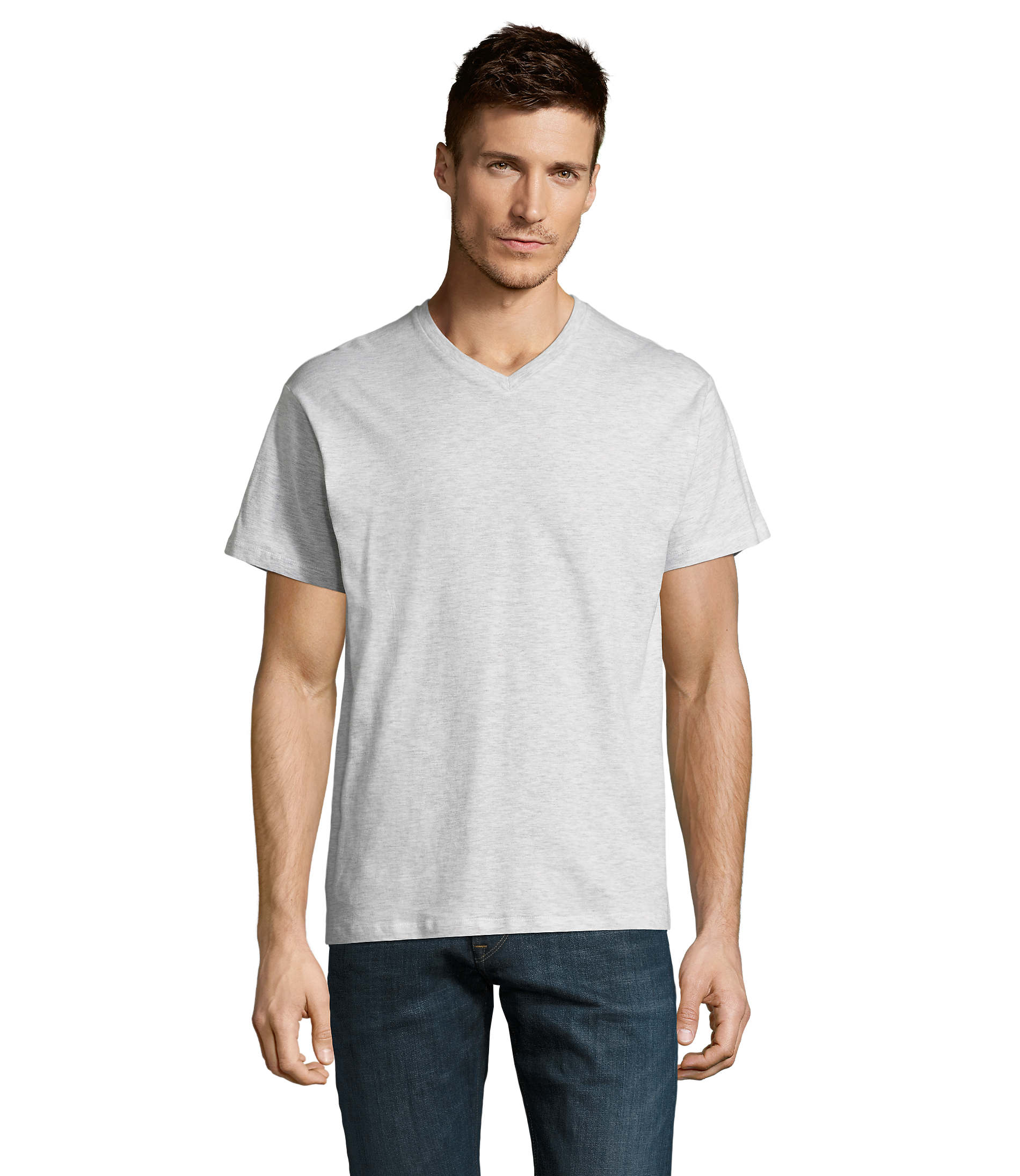 SOL'S VICTORY, men's v-neck t-shirt, 100% semi-combed ringspun cotton jersey 150, reinforcing tape on neck, short sleeves, 2 rib thicknesses at collar, tubular, (1) ash : 98 % cotton / 2 % viscose, (2) grey melange : 85 % cotton / 15 % viscose. About sizes matching, please refer to the size chart in the product documentation section.