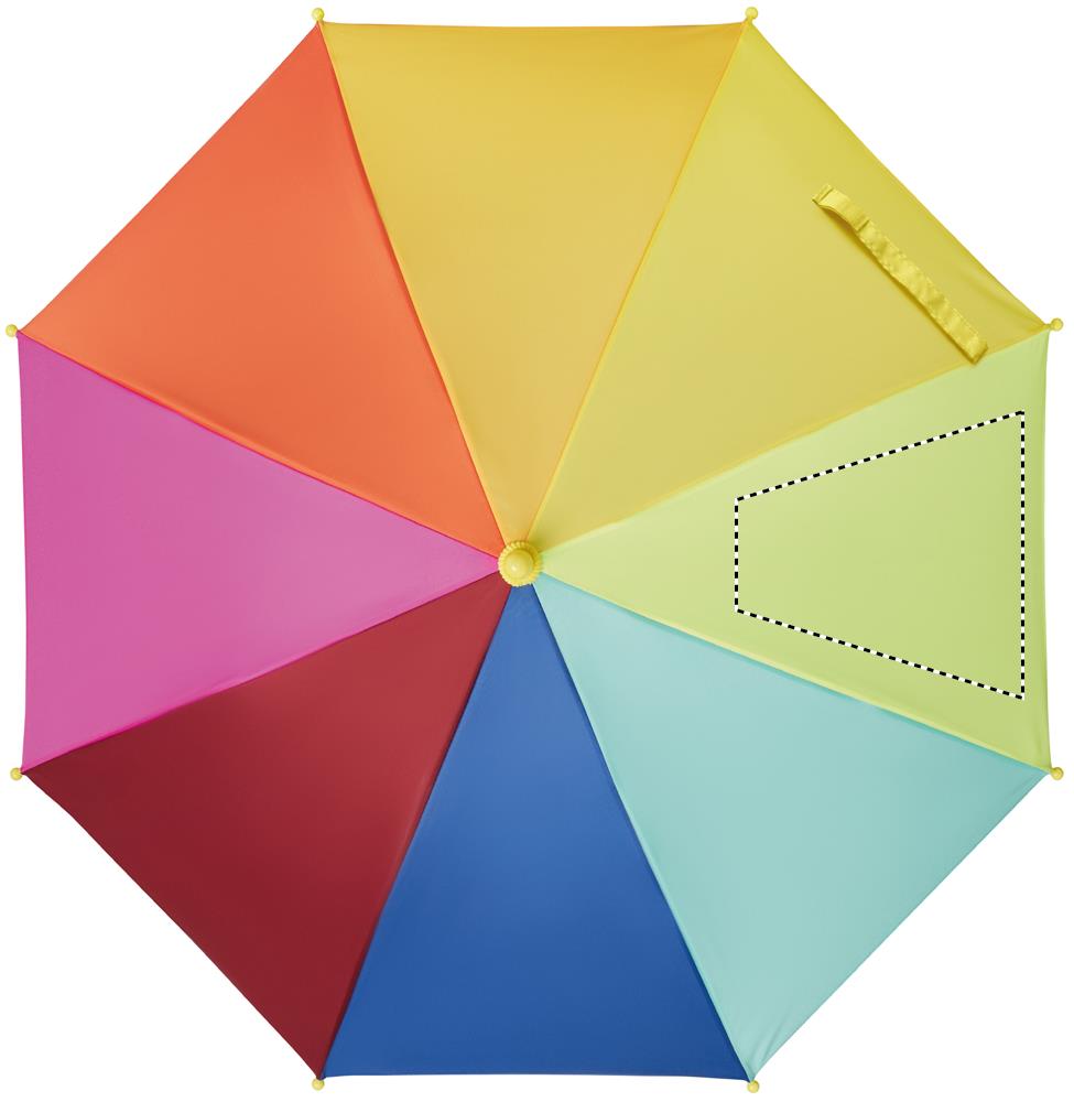 18-tolline laste vihmavari 190T vikerkaaremustriga pongee. Sellel on 8 paneeli. Käsitsi avamine ja sulgemine. Klaaskiust ribid ja raam. Plastikust käepide ja otsad. Kaarjas käepide.