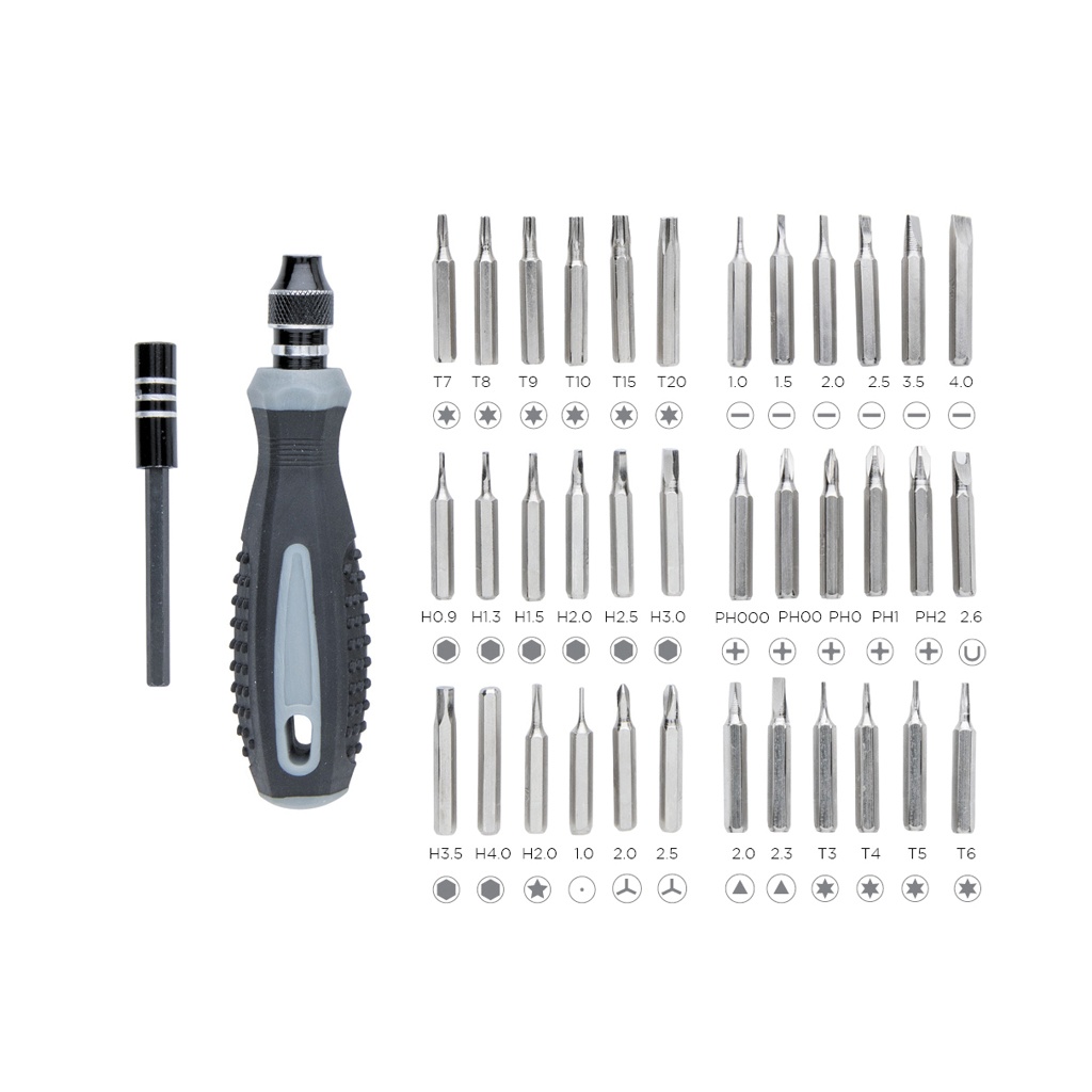38 tk tööriistakomplekt PP otsikute hoidjaga. Otsad valmistatud süsinikterasest. ABS ümbris läbipaistva ülaosaga.