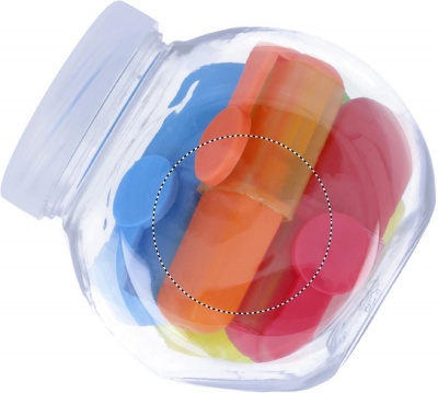 5 klambriga markerit väikeses läbipaistvas PET konteiner purgis.