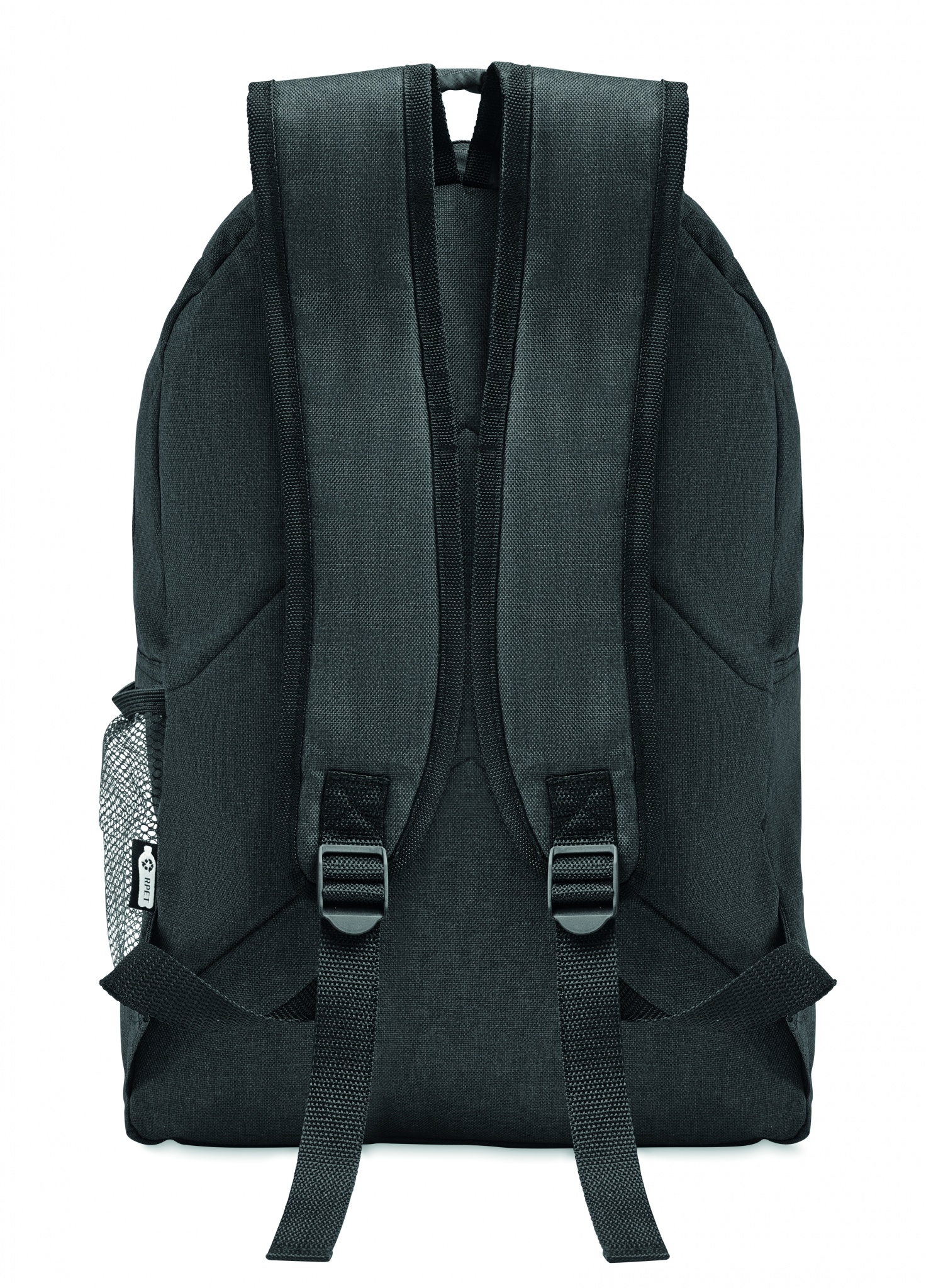 Seljakott 600D RPET 2 tooni polüestrist lukuga välistasku ja küljes võrktaskuga.