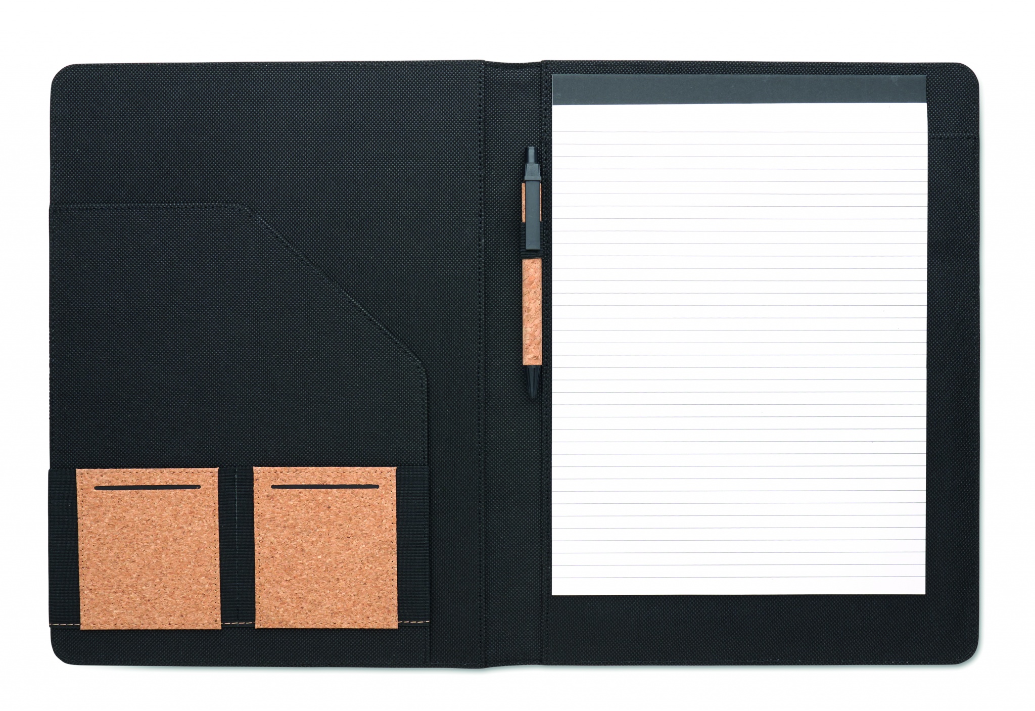 A4 korgist konverentsimapp. Korduvtäidetav A4 märkmik. 30 taaskasutatud paberiga vooderdatud lehte. Sobiv pliiats ja pliiatsihoidja. 2 kaardihoidjat ja üks suur sahtel.