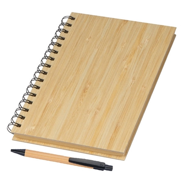 Stiilne ökokomplekt, mis koosneb bambuskaanega, spiraalköites ja 160 taaskasutatud paberist vooderdatud lehest DIN A5 sülearvutist ning sinise plastikust täidisega bambusest pastapliiatsi ja plastikrakendustega. Graveerime teie logo märkmikukaane välisküljele.