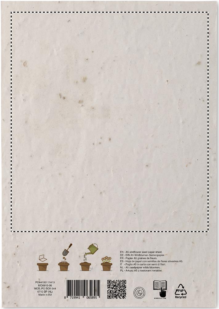 Metslilleseemnetest taaskasutatud paberileht A5 formaadis (80 gr/m²). Valmistatud EL-is.