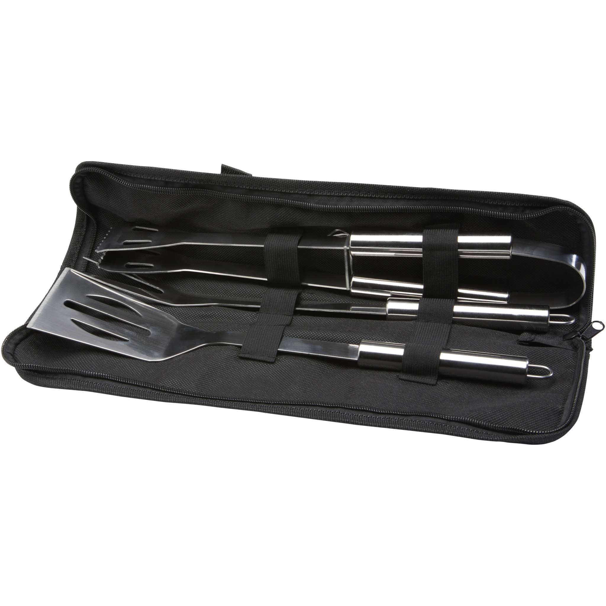 3-osaline grillikomplekt labida (34,8 x 7,5 cm), kahvli (35,4 x 3,35 cm) ja tangiga (35 x 6,8 x 4 cm). Kõik tarvikud tarnitakse kerges ümbrises, et oleks lihtne kaasas kanda ja hoiustada. Ideaalne grillitarvik aeda või sõprade ja perega õues grillimiseks kaasa võtmiseks.