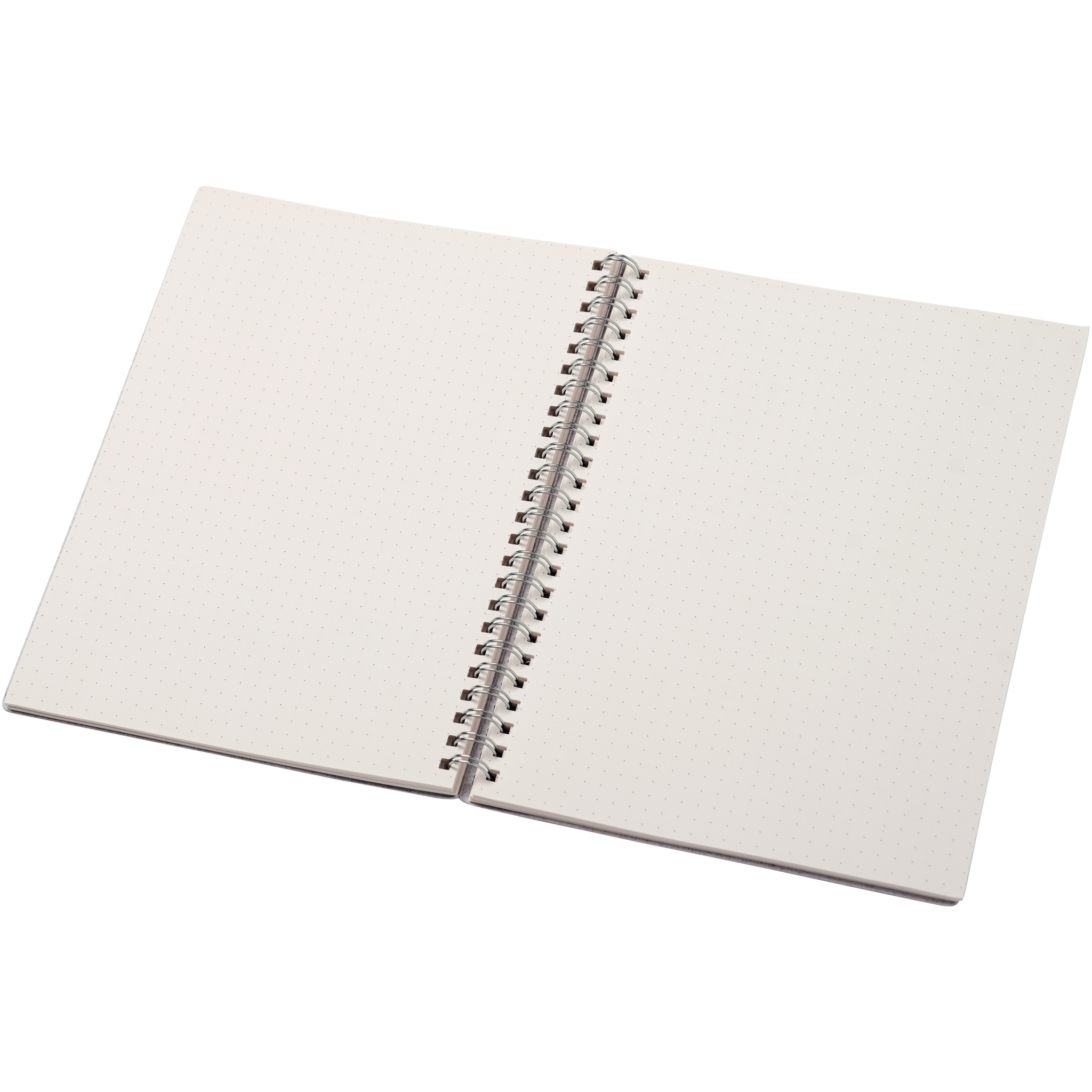 A5-suuruses traat-o-märkmik, mis on valmistatud vastutustundlikult hangitud kaanematerjalidest, mis sisaldavad puuvillajäätmeid (15%) ja tarbimisjärgseid taaskasutatud jäätmeid (40%). Sisaldab 80 lehte, 80 g/m2 100% vastutustundliku päritoluga taaskasutatud paberit punktiirrestiga. Punktiline paigutus ühendab jooneliste, tavaliste ja ruuduliste lehtede eelised, pakkudes samal ajal struktuuri ja ergutades loovust, muutes selle sülearvuti sobivaks paljudele kasutajatele. Tänu spiraalile saab sülearvuti mugavuse huvides lamedalt lamada ja seda saab hõlpsalt kokku panna. Valmistatud Itaalias.