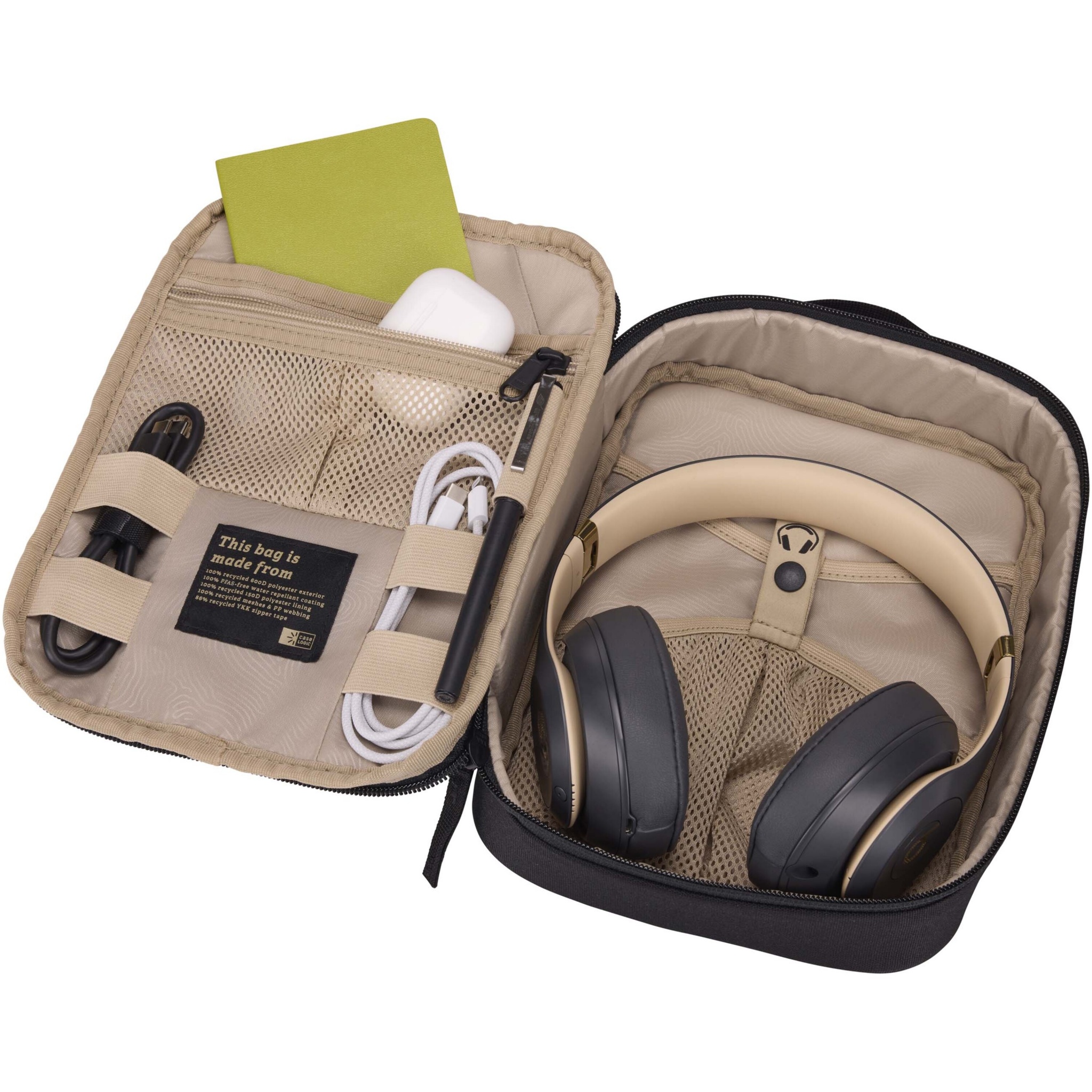 Case Logic Invigo tarvikute kotis on ruumi kaablite, kõrvaklappide, adapterite ja muude isiklike esemete jaoks. Suurepärane kasutada suuremas kotis või eraldi. See kott on valmistatud 100% taaskasutatud 600D polüestrist välispinnaga ja 150D polüestervoodriga. Sellel on pliiatsitasku, lukuga tasku, suur tasku ja spetsiaalsed hoiuruumid suuremate esemete, näiteks kõrvaklappide jaoks.