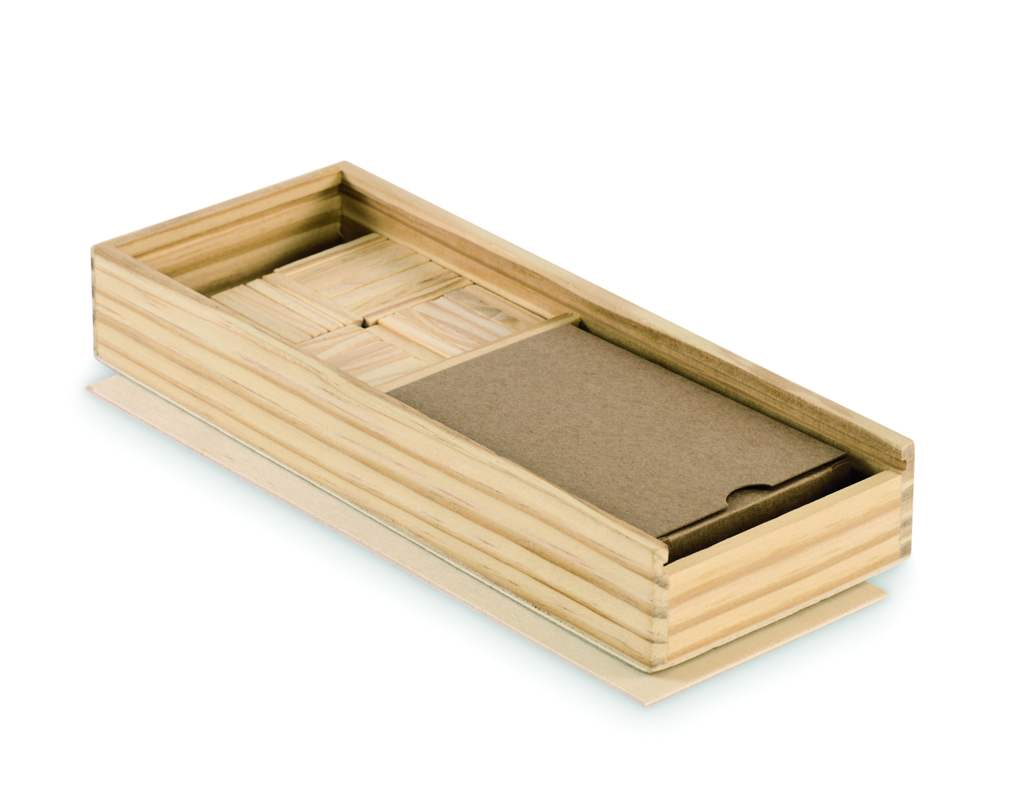 Puidust doomino ja taaskasutatud paberist mängukaartide komplekt. MDF-karbis.
