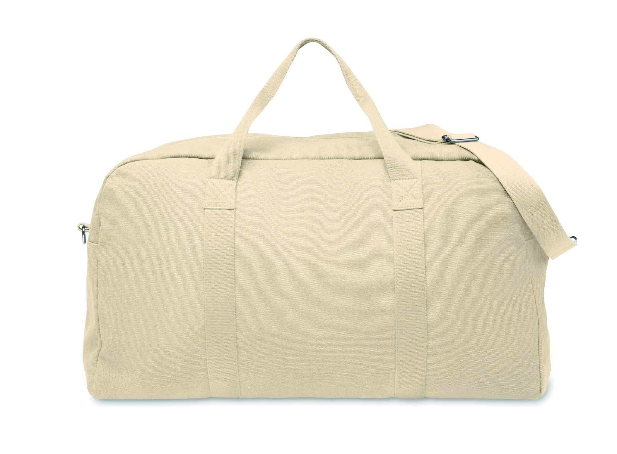 Taaskasutatud 450 gr/m² kangast (60% taaskasutatud puuvill ja 40% taaskasutatud polüester) reisikott reguleeritava ja eemaldatava puuvillase rihmaga.