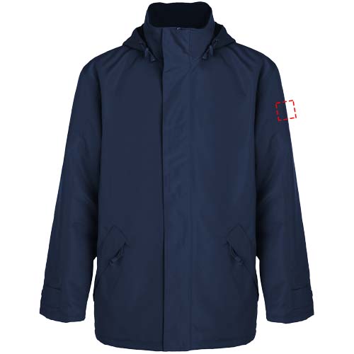 Polsterdatud veekindel jope. Keskne vormitud tõmblukk koos sobiva klapiga. Kõrge kaelus kokkupandava kapuutsiga. Tõmbluku ja klapiga küljetaskud. Rihmadega reguleeritavad kätised. Kaks haak-aaskinnitusega sisetaskut. Siseviimistluse tõmblukk. Veekindel. Tuulekindel. Modellid on 120/122 cm ja kannavad suurust 6.