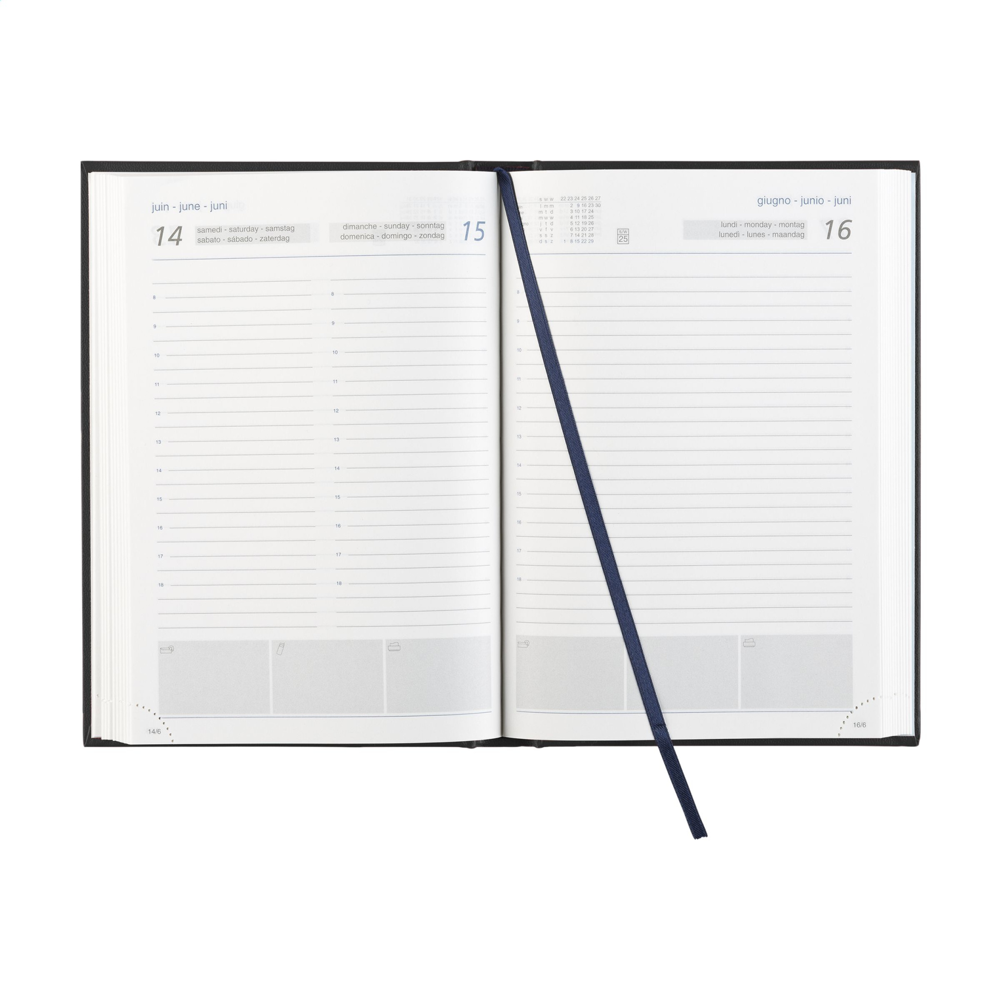 Kuuekeelne kontoripäevik: EN, NL, F, D, I ja ES. Vastupidava polsterdatud Balacron kaanega ja esiküljel dekoratiivselt reljeefse reljeefiga aastaarvuga, 70 g valge, FSC Mix sertifikaadiga paber, trükitud 2 värvitoonis, niidiga köidetud, ärarebitavate dateeritud nurkadega, üks päev lehel (laupäev ja pühapäev kokku), aasta planeerija jooksev aasta ja järgmise aasta 2 kvartalit, märkige ruumi iga päeva kohta, lisaleheküljed kasulikku teavet. Ligikaudu A5 suurus.