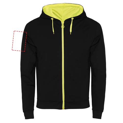 Fluorvärvi detailidega harjamata fliisist jope. Keskne tõmblukk kontrastse tõmmitsaga. Kapuuts voodriga mikroperforeeritud polüesterkangast ja kontrastset fluorivärvi. Kontrastset fluorivärvi nöör ja metallist aasad. 1x1 soonik varrukatel ja vöökohal. Kaks laia äärega esitaskut. Sisekrael tugevdatud kaetud õmblused. Eemaldatav etikett.