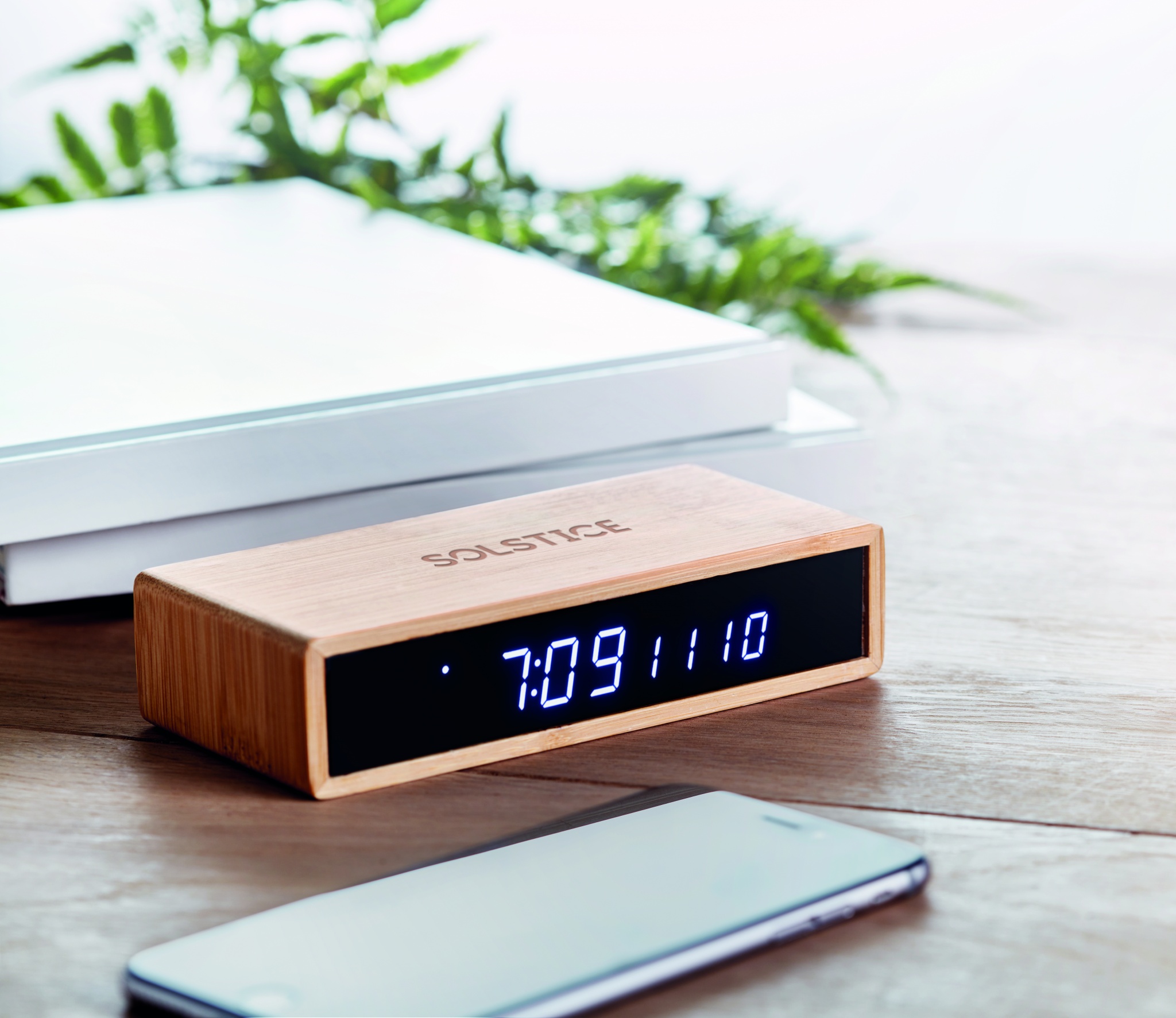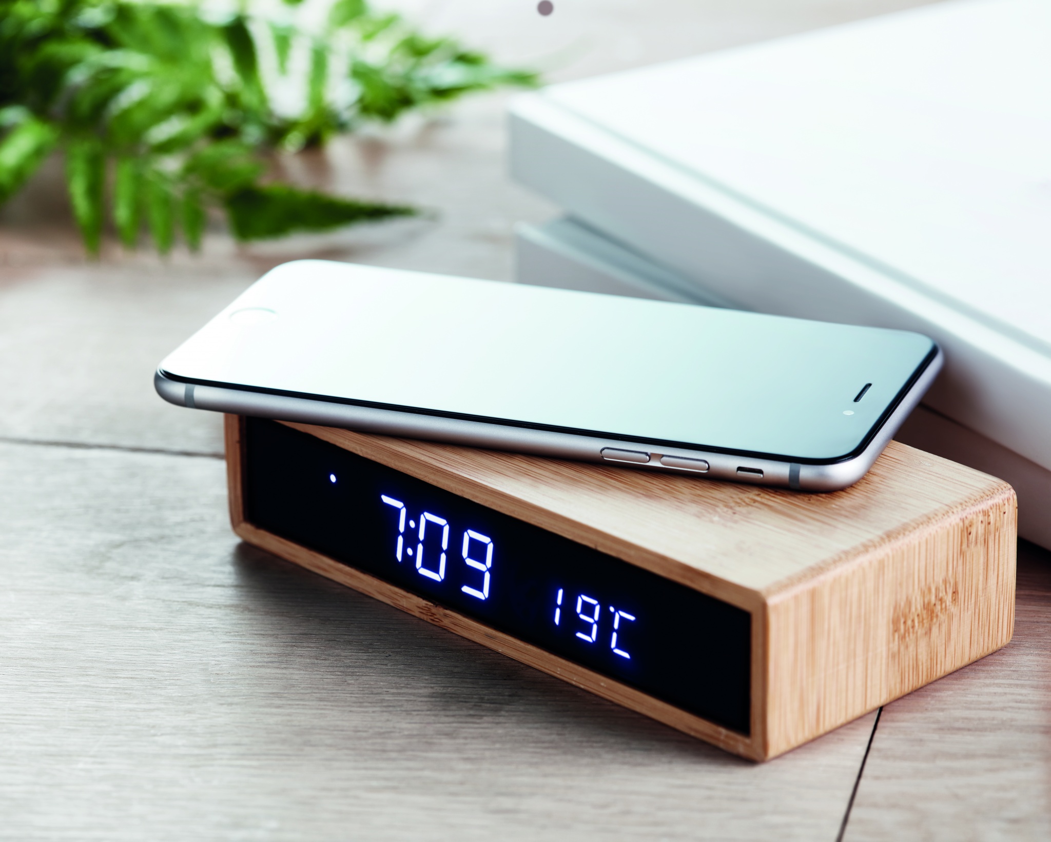 Juhtmeta laadimisseade, sealhulgas sinine LED-ajaekraaniga äratuskell ja temperatuur bambusest korpuses. Kaasas AC-DC 2 kontaktiga pistikuadapter. Juhtmeta väljund: DC5V/1A (5W). Ühilduvad uusimad androidid, iPhone® 8, X ja uuemad. Ei sobi kasutamiseks Ühendkuningriigis. Bambus on looduslik toode, ühe eseme värvis ja suuruses võib esineda väikesi erinevusi, mis võivad mõjutada lõppviimistlust.