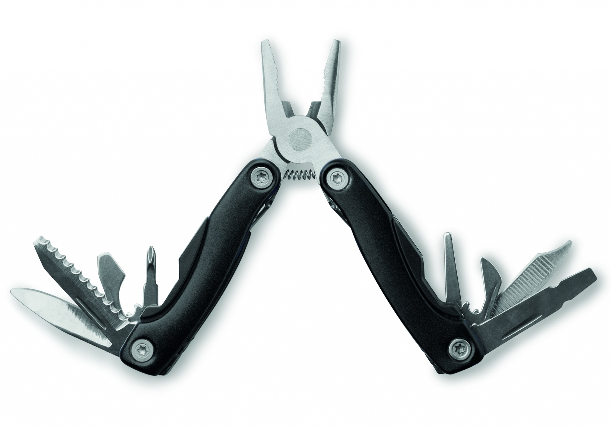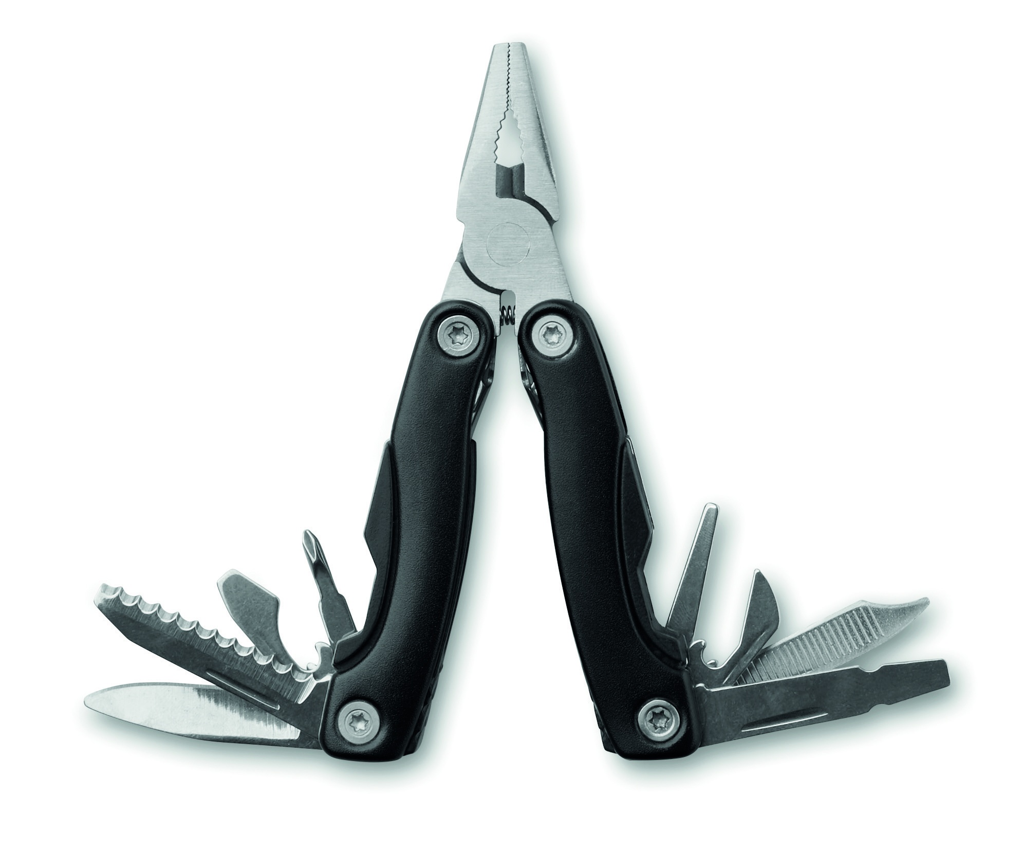 Roostevabast terasest kokkupandav multitööriist koos roostevabast terasest tangidega. 9 tööriista funktsiooni. Kaasas 600D polüesterkott.