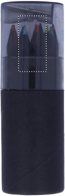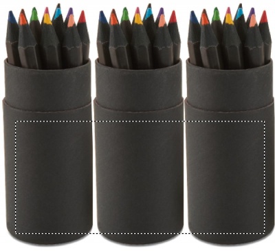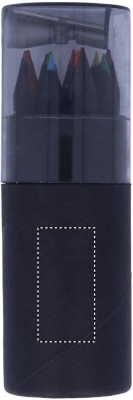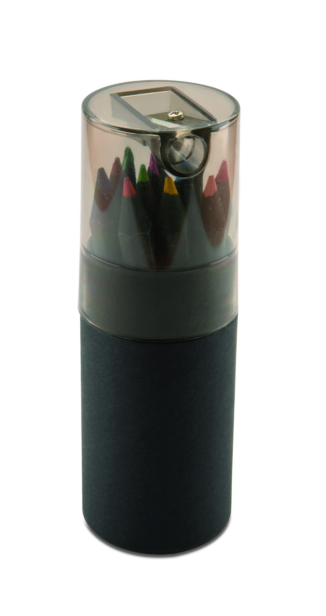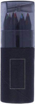 See musta värvi paberist torukarp sisaldab 12 värvipliiatsit ja karbi kaanes pliiatsiteritajat.