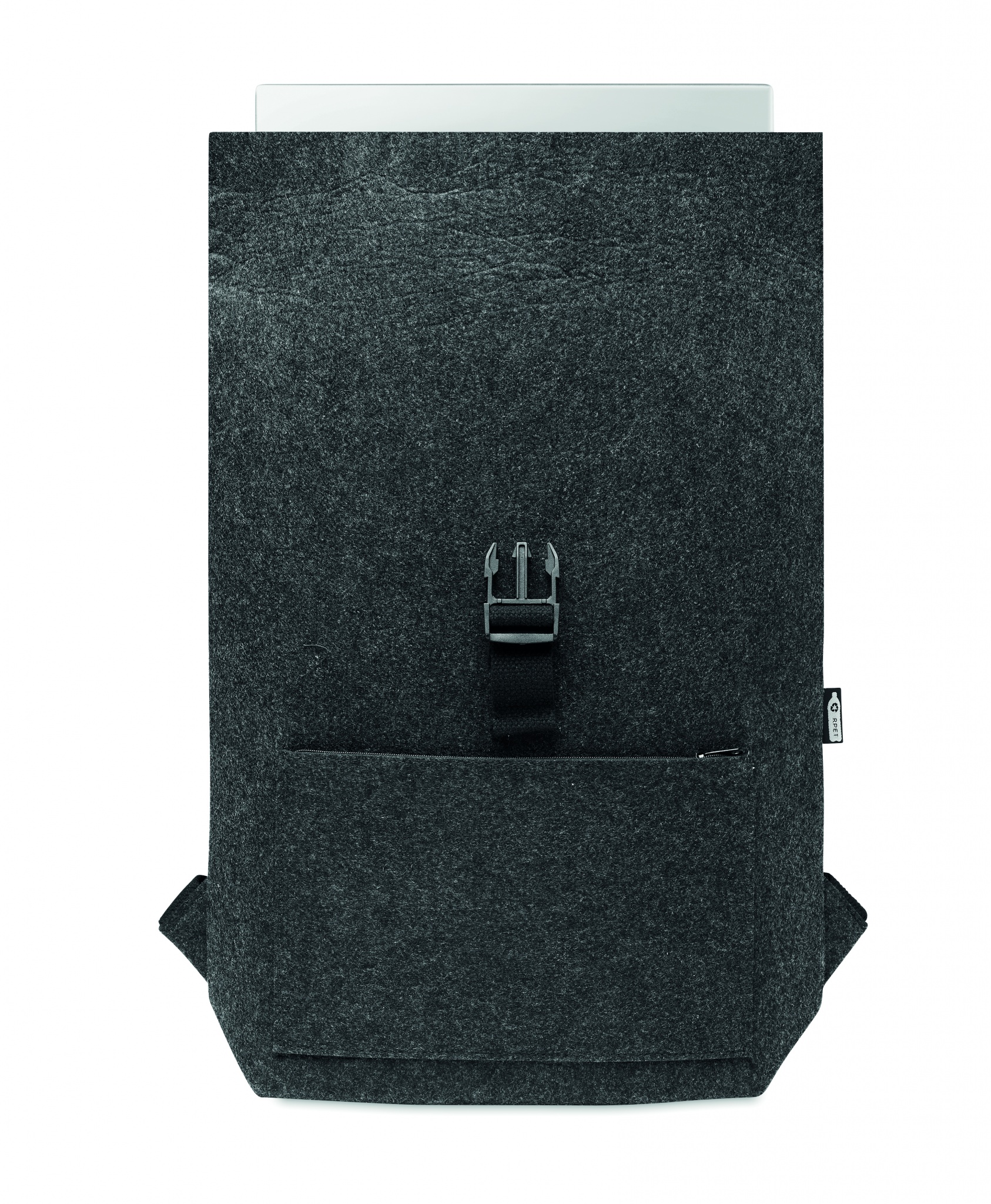 RPET vildist seljakott puuvillase rihmakinnitusega ja lukuga tasku ees. Sellel on sülearvuti sahtel.