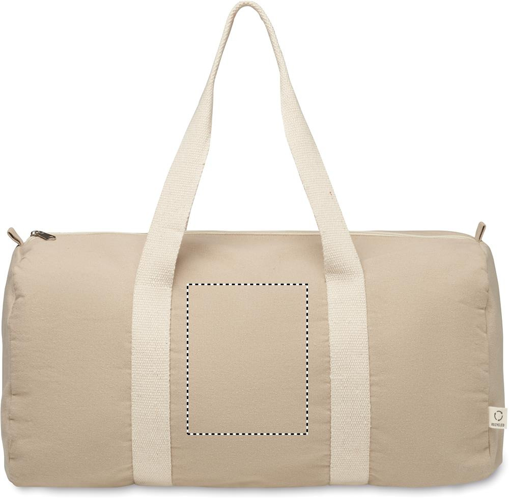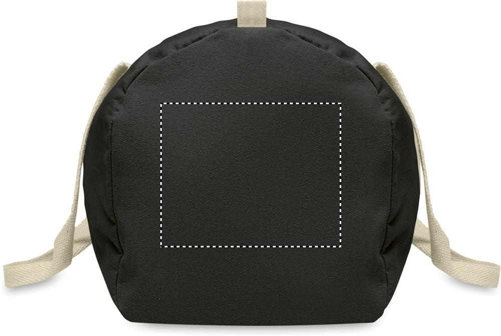 Must pikkade sangadega 320 gr/m² taaskasutatud puuvillast (80%) ja taaskasutatud polüestrist (20%) tõmblukuga küljesahtli ja lukuga sisetaskuga kott, spordi- või reisikott.