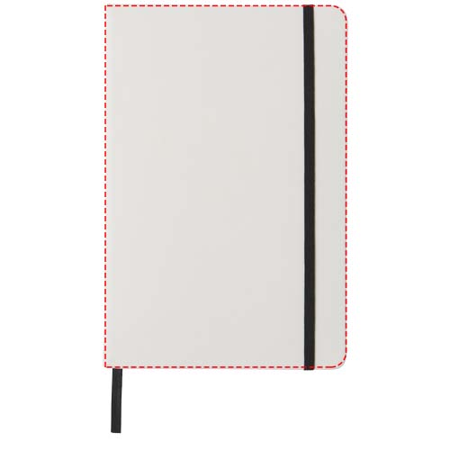 Valge A5 märkmik värvilise elastse kinnise ja paelaga. Sisaldab 80 lehte (60g/m2) joonega paberit. Kaanele võimalik digitrükk.