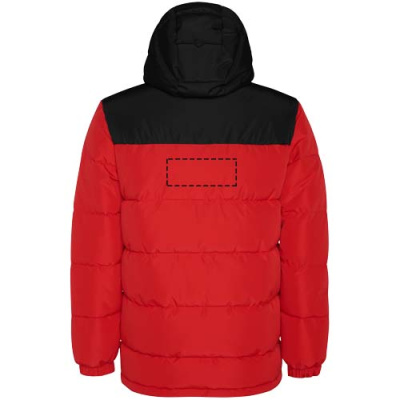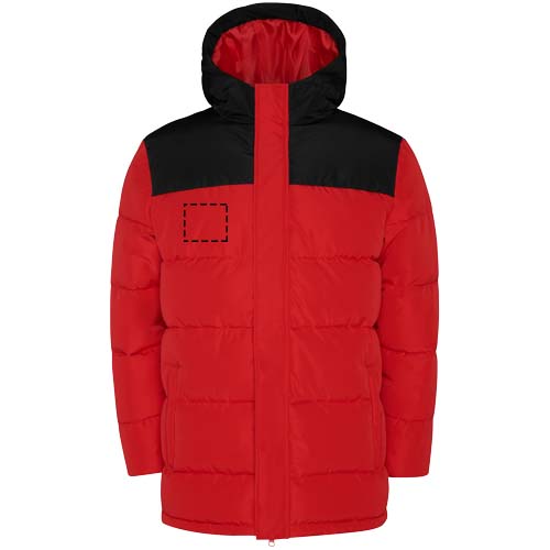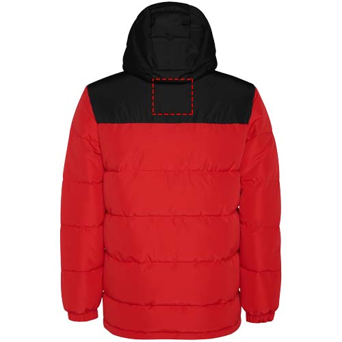 Polsterdatud jakk fikseeritud kapuutsiga. Ees tõmblukk kaetud plekiga. Lõuakaitse. Kaks lukuga küljetaskut. Elastsed kätised.