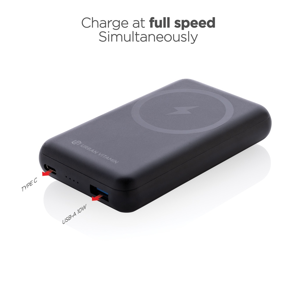 Laadige oma telefoni selle kiirlaadimise akupangaga kuni 2,5 korda. Õhukesel ja kompaktsel akupangal on integreeritud kiire 10 W juhtmevaba magnetlaadija. Sellel on mitmekülgne sisseehitatud kokkupandav tugijalg, mis hoiab teie telefoni mugava vaatenurga jaoks püsti. Tänu ülikiirele C-tüüpi PD-pordile laeb akupank rekordajaga uuesti. Telefoni kuni 50% laadimine võtab aega vaid 30 minutit. Aeglane laadimine on midagi minevikust. Akupank sisaldab kauakestvat A-klassi 10 000 mAh akut, et laadida kõiki oma seadmeid reisidel ja seiklustel. Topeltväljundiga A ja C-tüüpi port võimaldavad laadida kuni 2 seadet korraga. Valmistatud RCS-i (Recycled Claim Standard) sertifitseeritud ringlussevõetud ABS-ist Kogu taaskasutatud sisaldus: 16% eseme kogukaalust. RCS-sertifikaat tagab taaskasutatud materjalide täielikult sertifitseeritud tarneahela. Urban Vitamin tooted on valmistatud ilma PVC-ta ja pakendatud vähendatud plastikpakendisse. USB: 5 V 3,0 A Tüüp C: 5 V 3,0 A, 9 V 2,22 A, 12 V 1,5 A.
