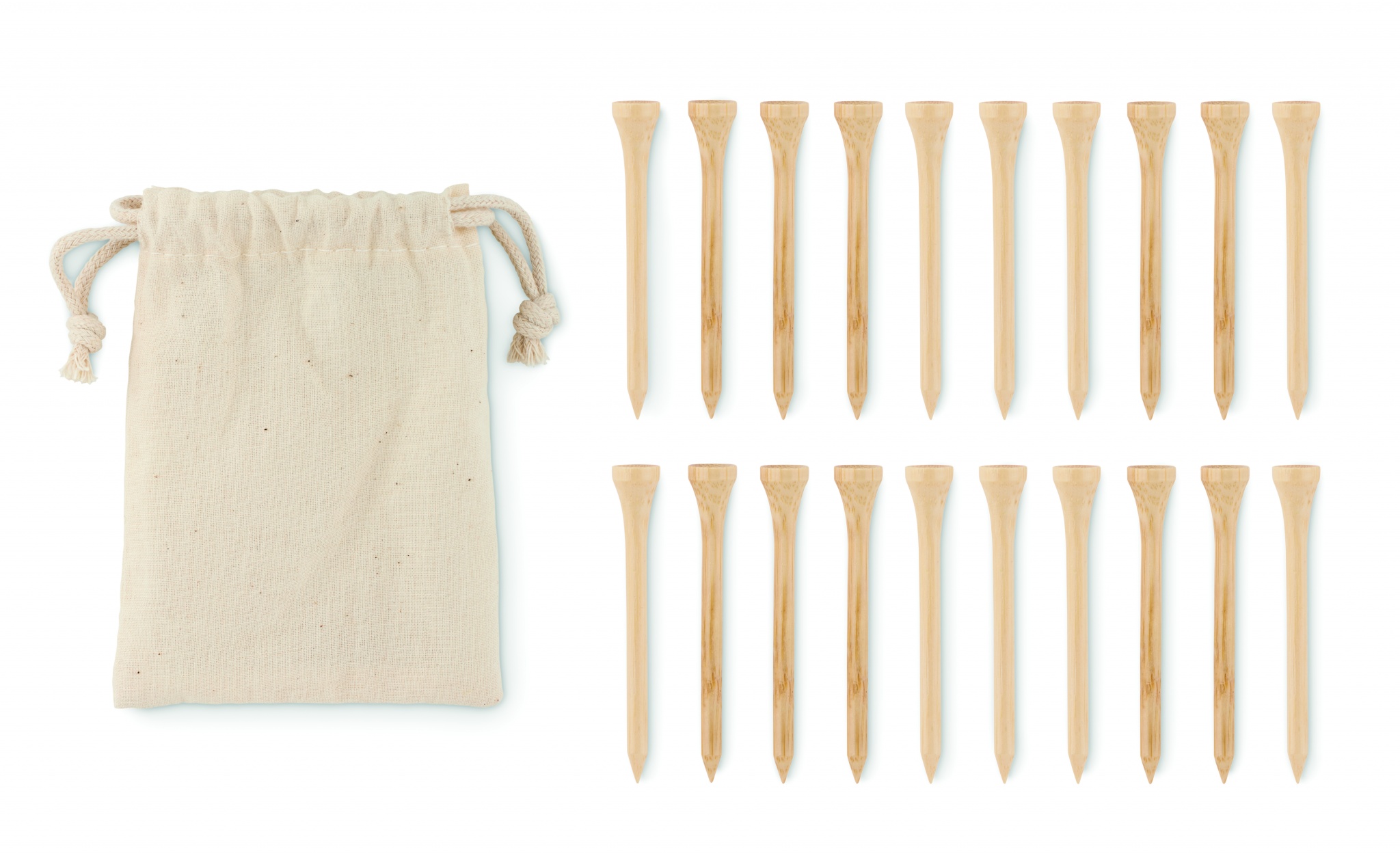 Bambusta valmistettu golf tiisetti, puuvillapussissa. Luonnollisen materiaalin (bambu) vuoksi, tuotteiden värissä/ koossa saattaa olla erinäisyyksiä ja tämä voi vaikuttaa painatuksen lopputulokseen.